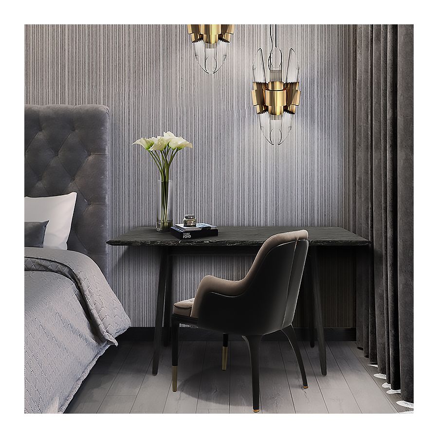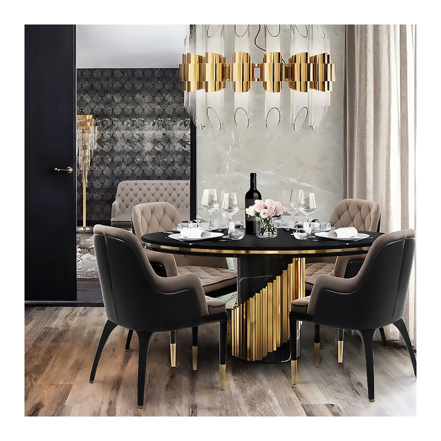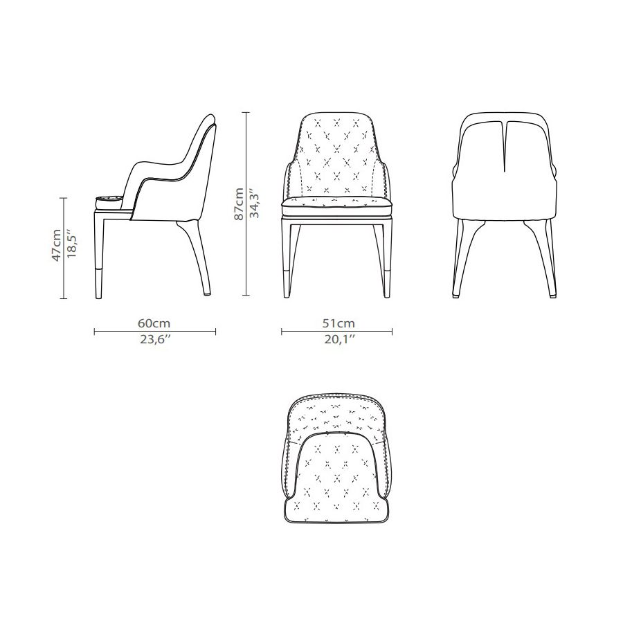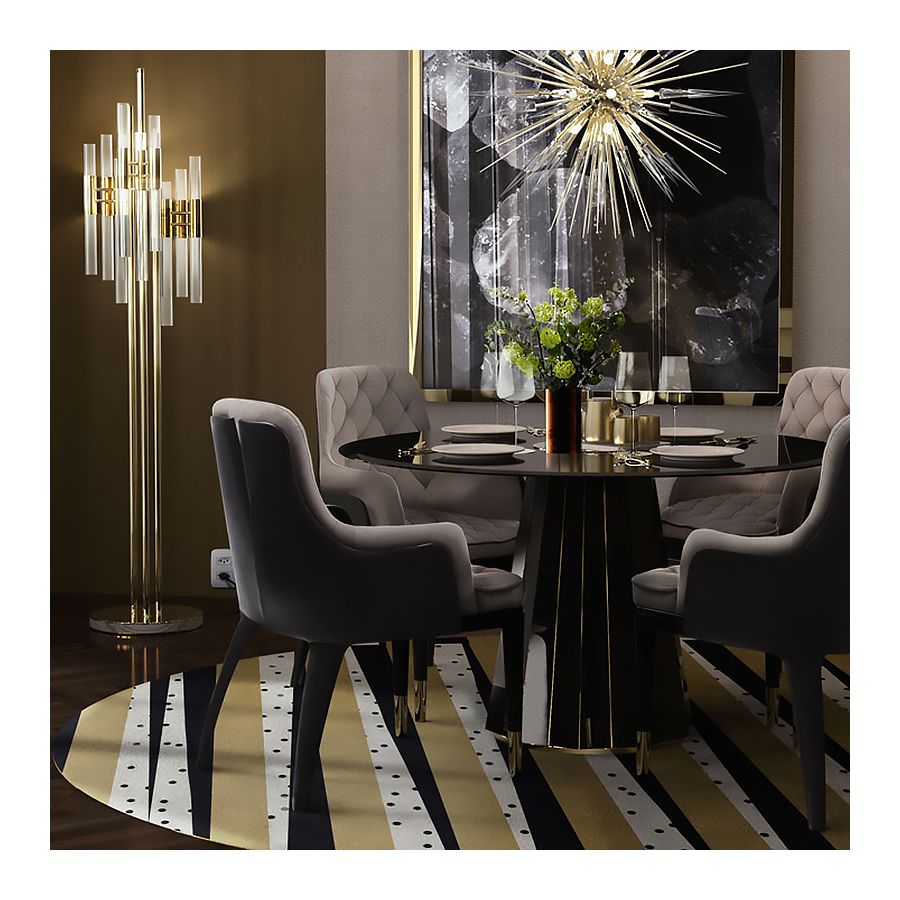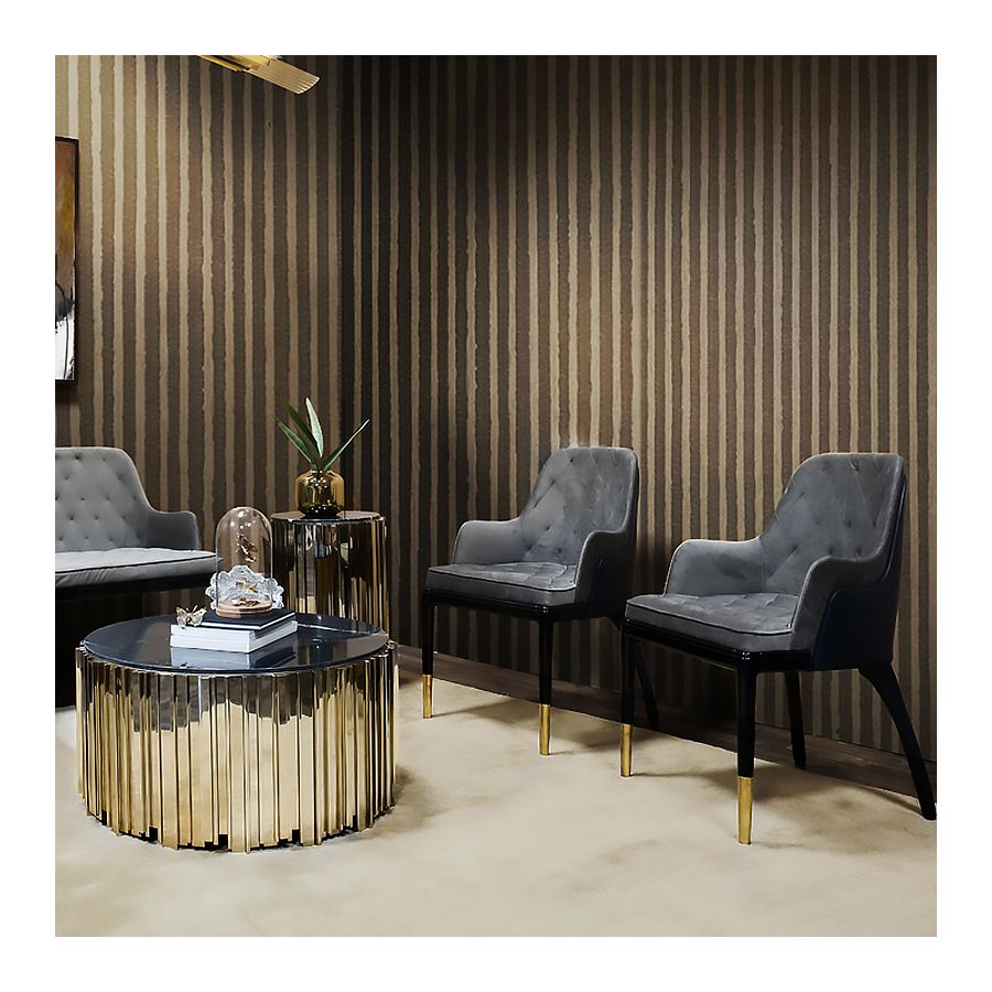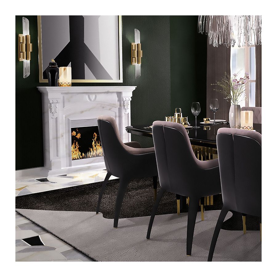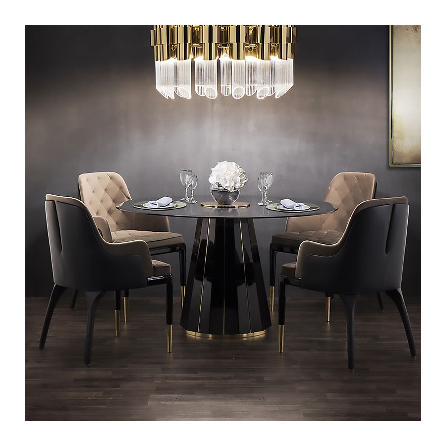 Charla dining chair is a splendid object of boundless elegance. This marvelous design is the perfect example of timeless lines with a modern twist, by using a complexity of luxurious materials, such as velvet, brass and lacquered wood.