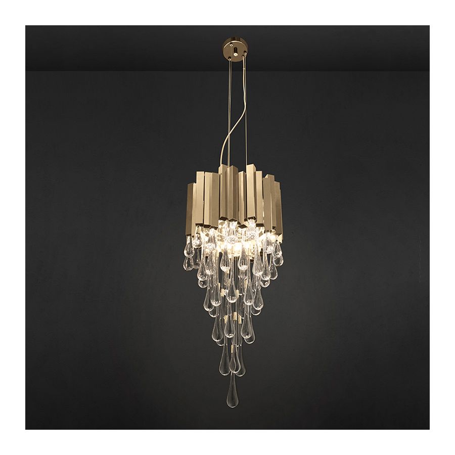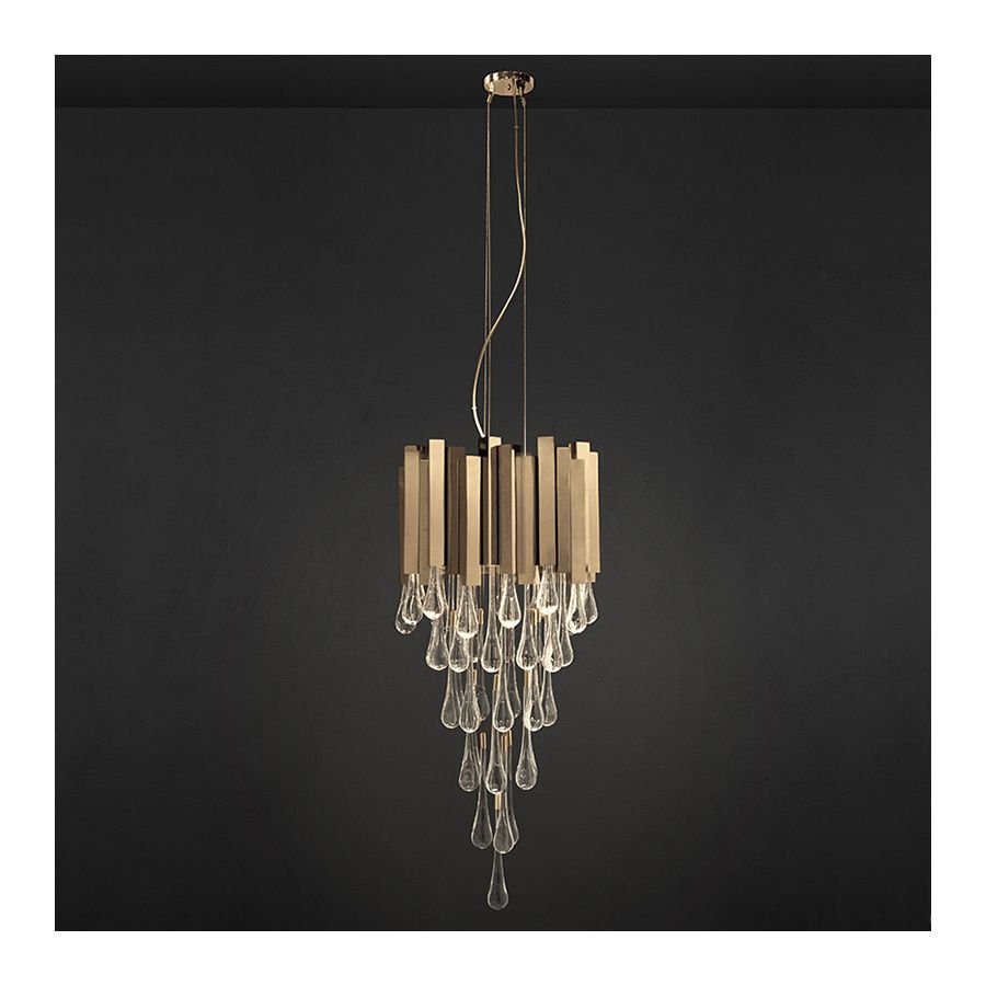 Impetuous in form and bold in character, this pendant from the Trump collection showcases striking asymmetrical stripes in gold-plated brass, contrasted by delicate crystal glass drops. The interplay of strength and elegance defines its classic-contemporary style, making it a refined yet daring statement piece.