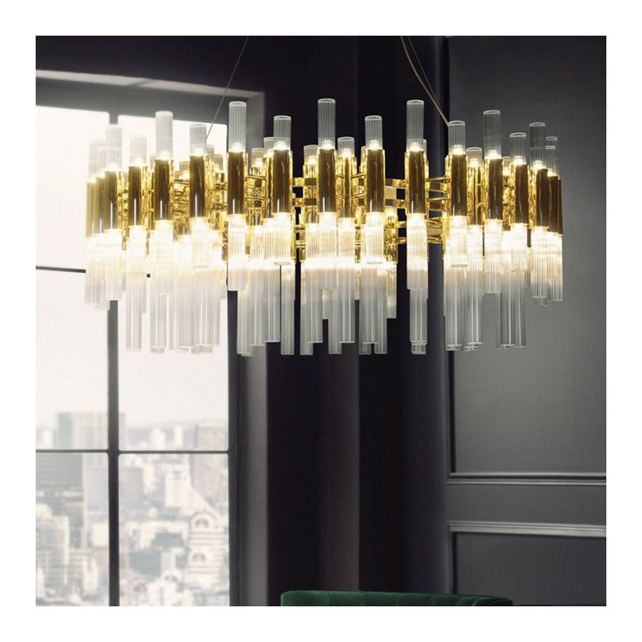 A powerful creation characterized by a circular shape made with gold plated brass combined with ribbed fine tubes of glass. The perfect combination of a glamorous sensation of waterfalls.