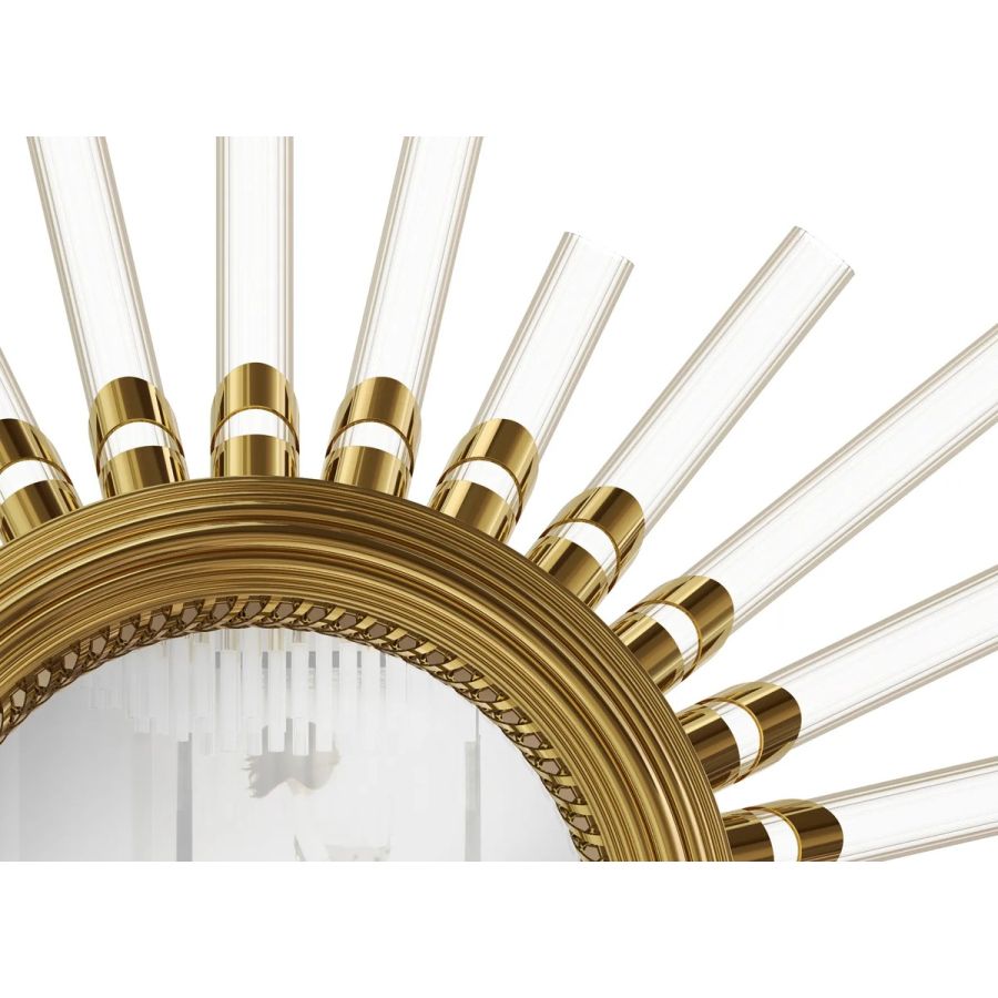 The Majestic Wall Light Mirror combines the radiant glow of a gold-plated brass circle with ribbed crystal glass cylinders, creating a captivating and awe-inspiring effect in any setting. The play of light and texture evokes a sense of enchantment and refinement, making it a perfect addition to upscale interiors. Crafted with meticulous attention to detail, this luxury mirror embodies the essence of desire and luxury.