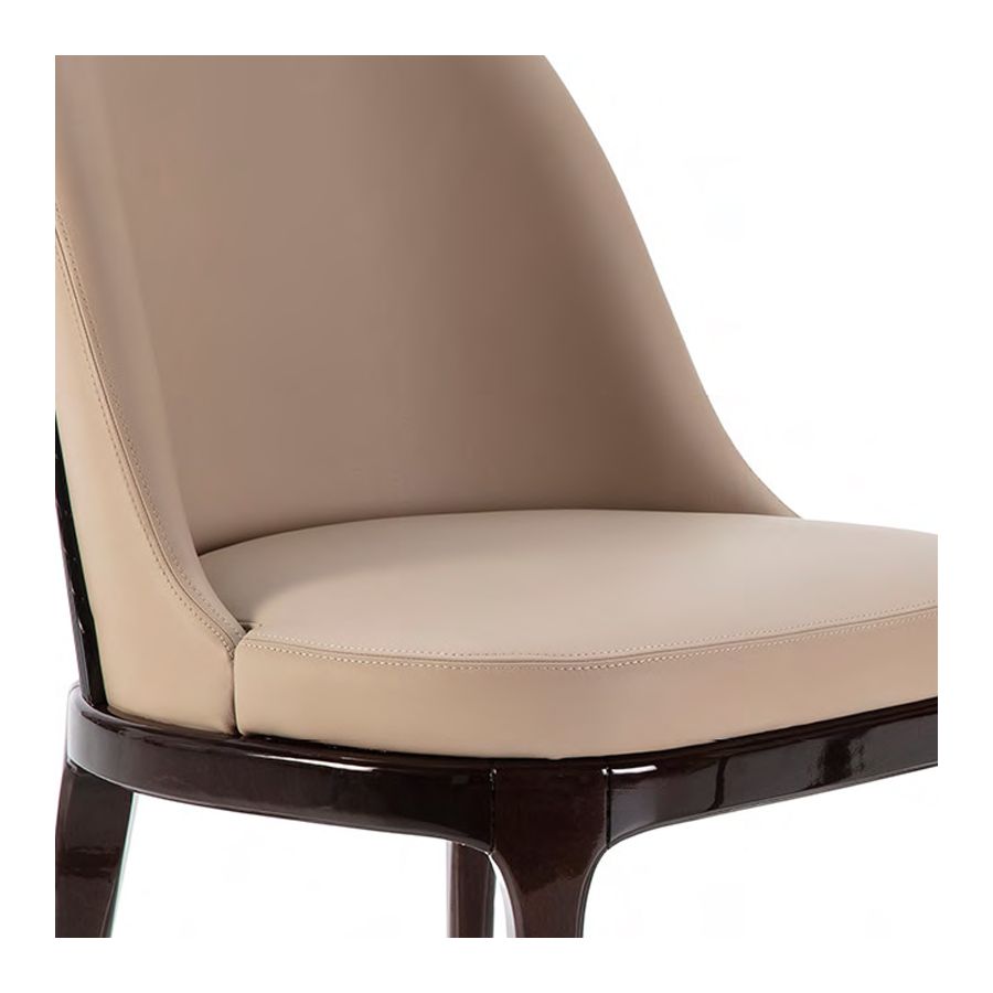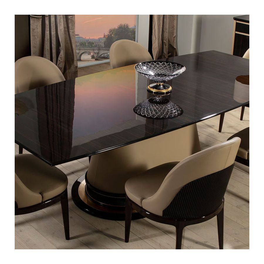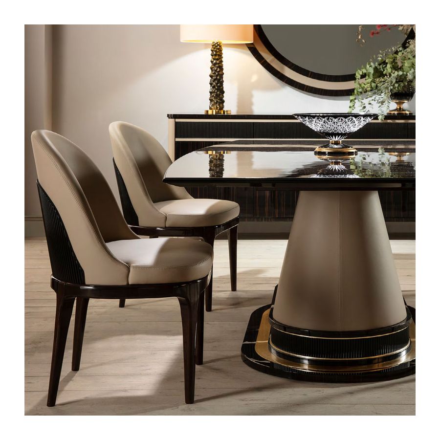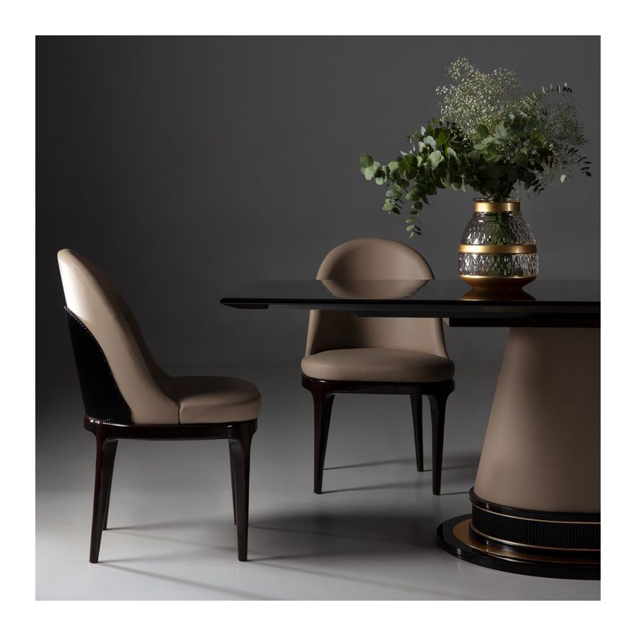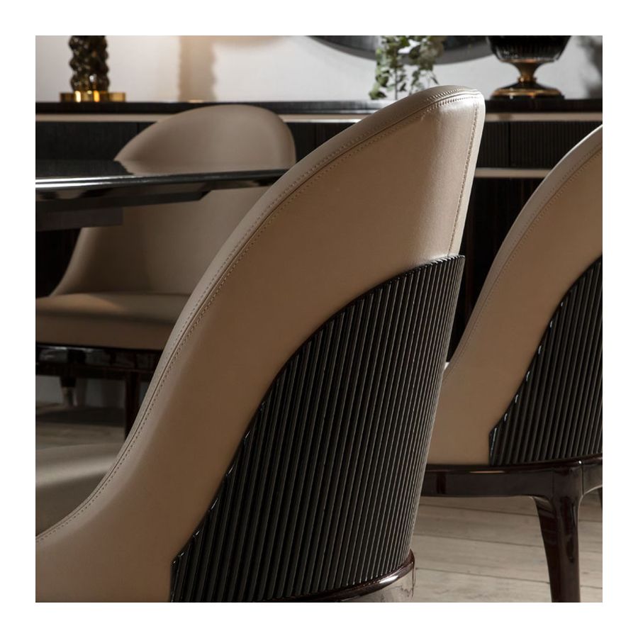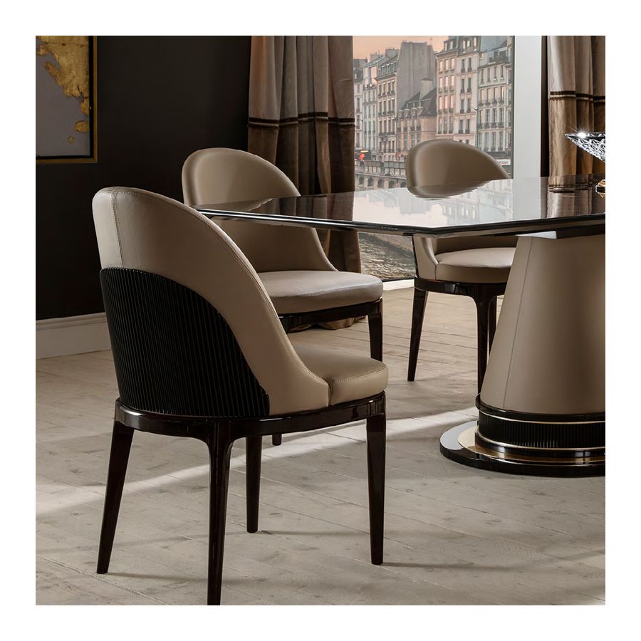 Matstol, fåtölj från Monaco-kollektionen är tillverkad av träram och läderklädsel. Behövd mängd läder: 2 m. Nettovikt: 10,00 Kg / 22,03 Ib Ytbehandling: Högblank Makassarträ (MAK.B) / Högblank svart trä (NB)