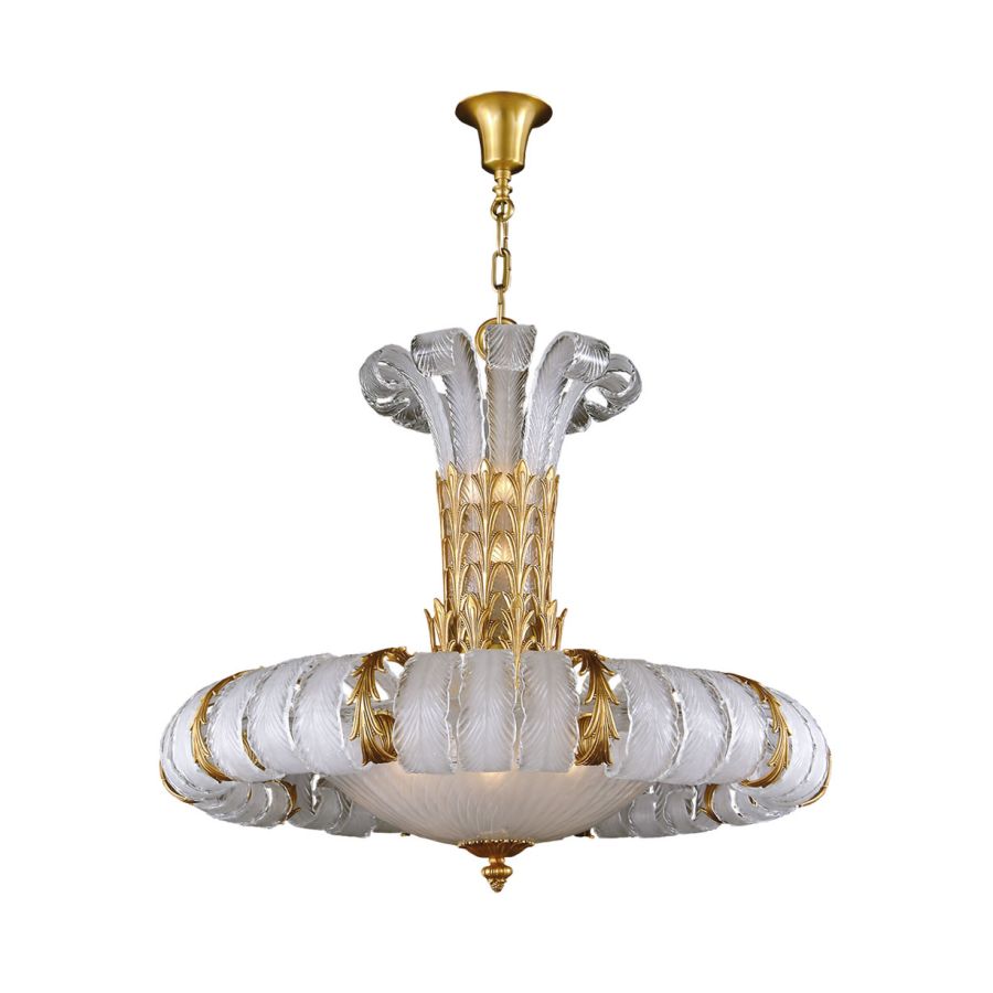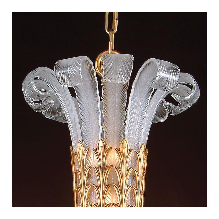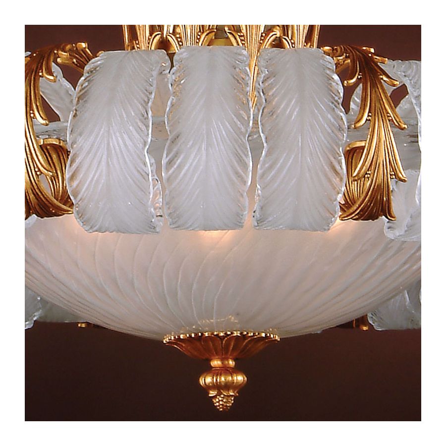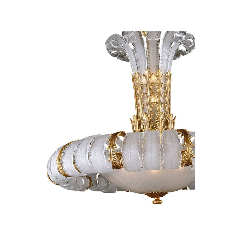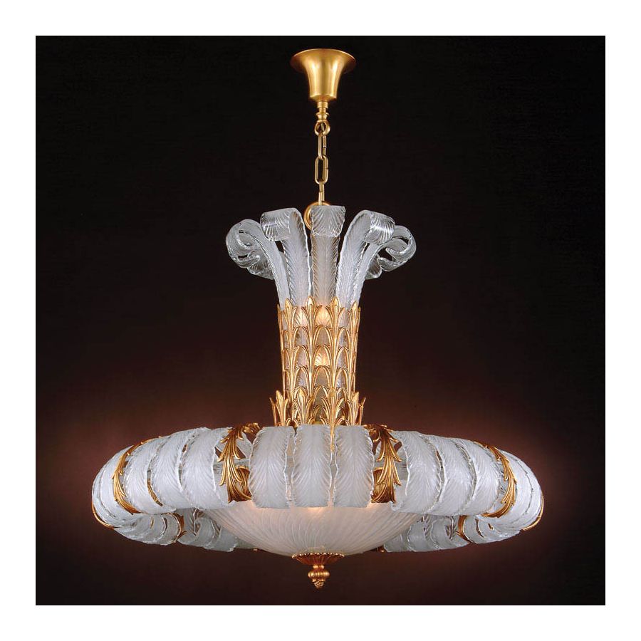 Ljuskrona är tillverkad av gjuten brons och venetianskt glas.