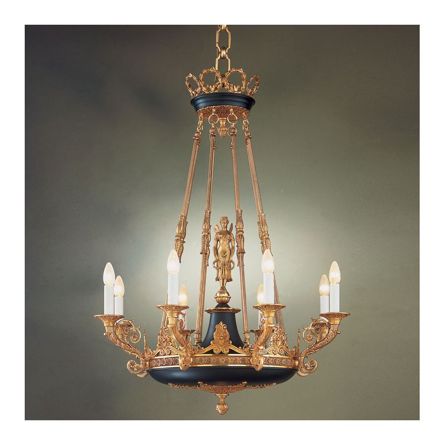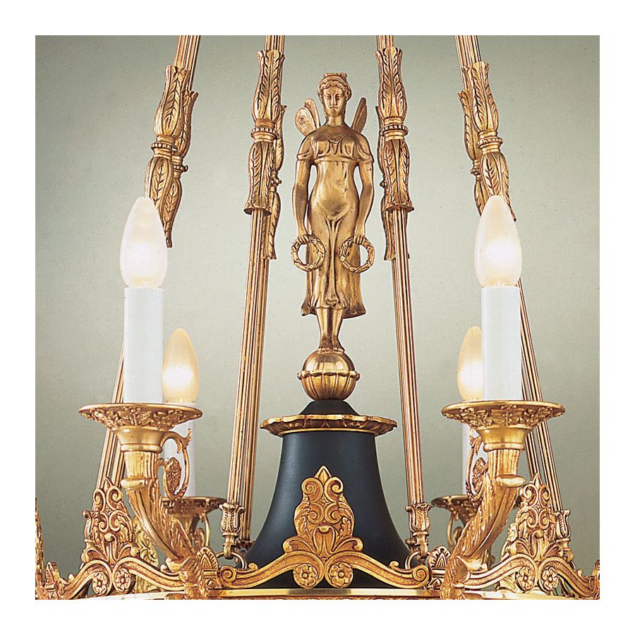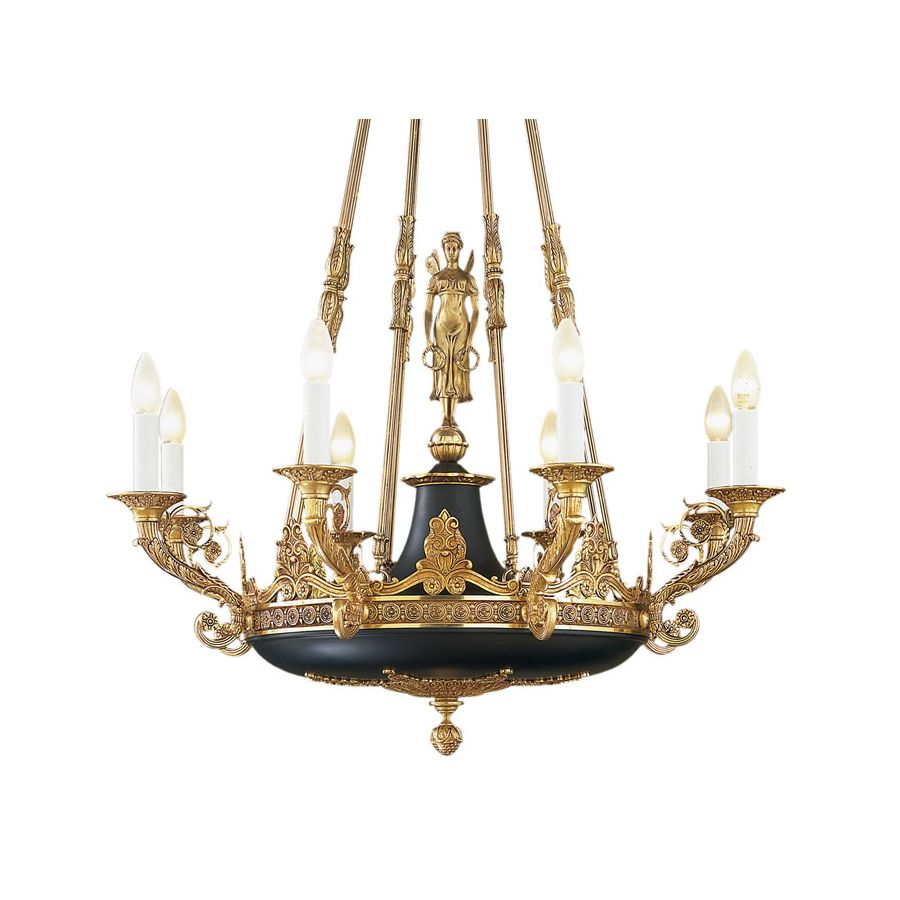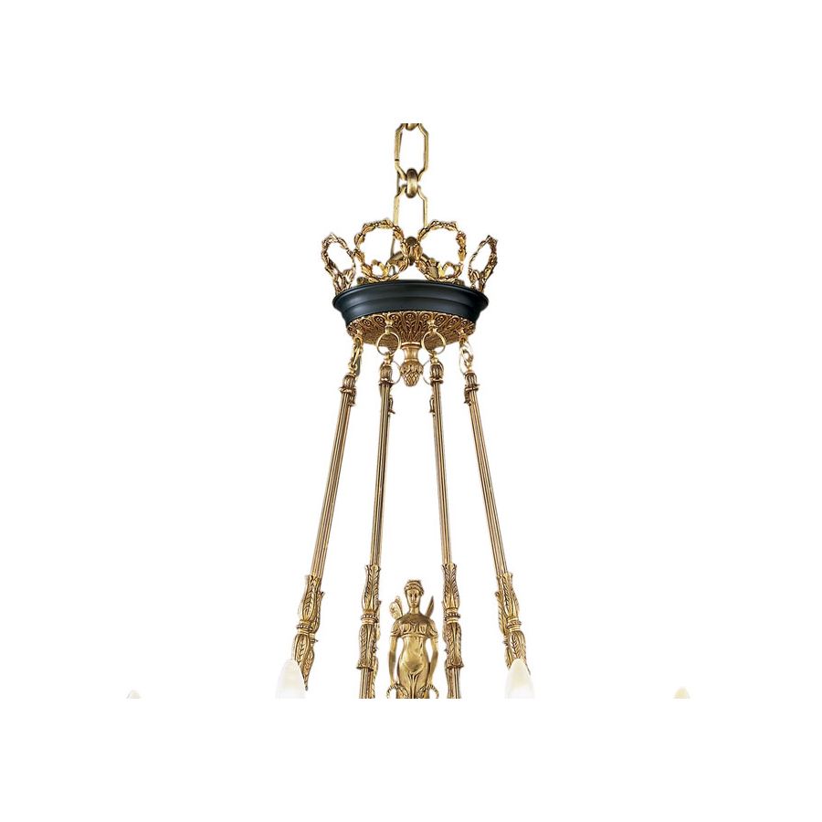 En fransk Empire-ljuskrona i brons och förgylld med åtta armar, baldakinen är förskönad med förgylld metall med öppet anthemion och stöder ljuskronans kropp som är krönt av en tazza med nyklassisk dekoration. Den stående bronsfiguren av en klassisk ung kvinna som representerar segern och trampar på jordklotet.