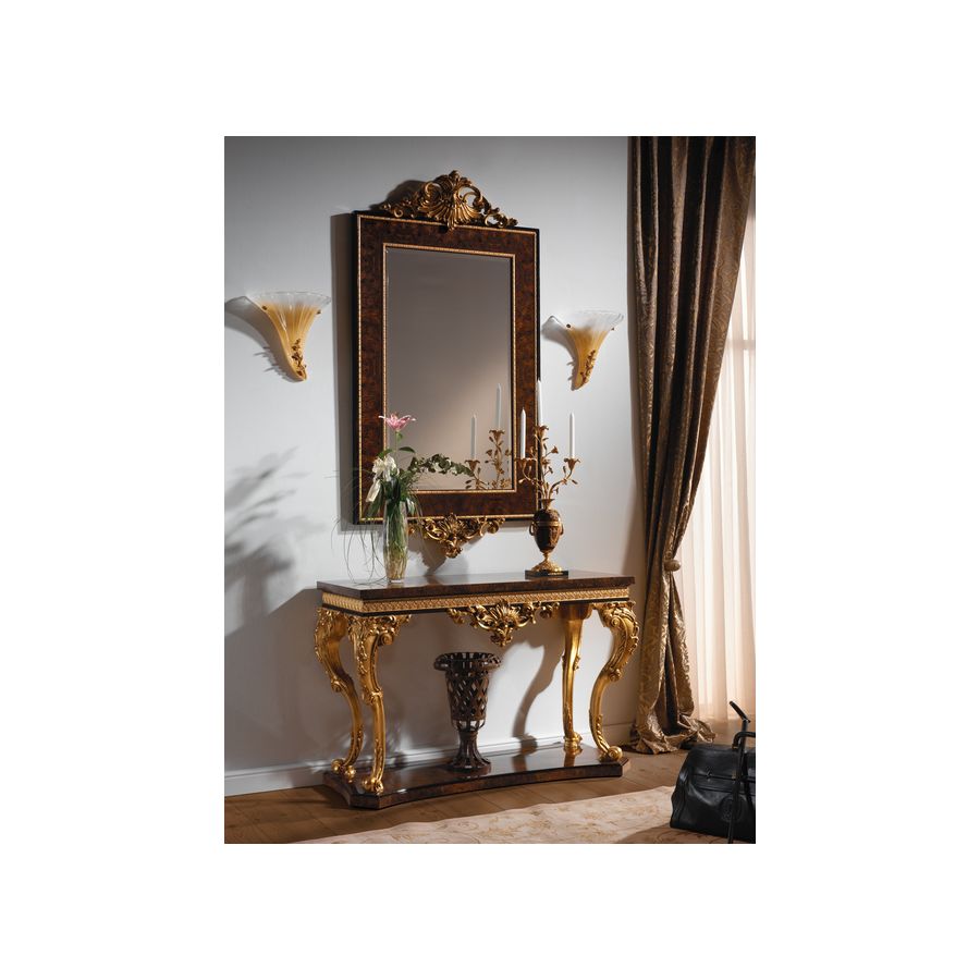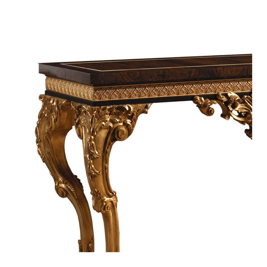 VOLGA-kollektionen tillverkas i valnötsfanér med elegant dekoration i sykomorträ. Utmärkande är den sandgjutna bronzen med antik guldfinish och det snidade träet som är dekorerat med antikt guldblad.