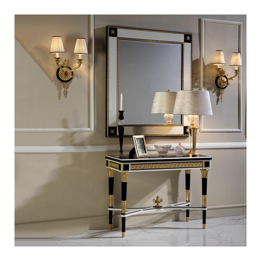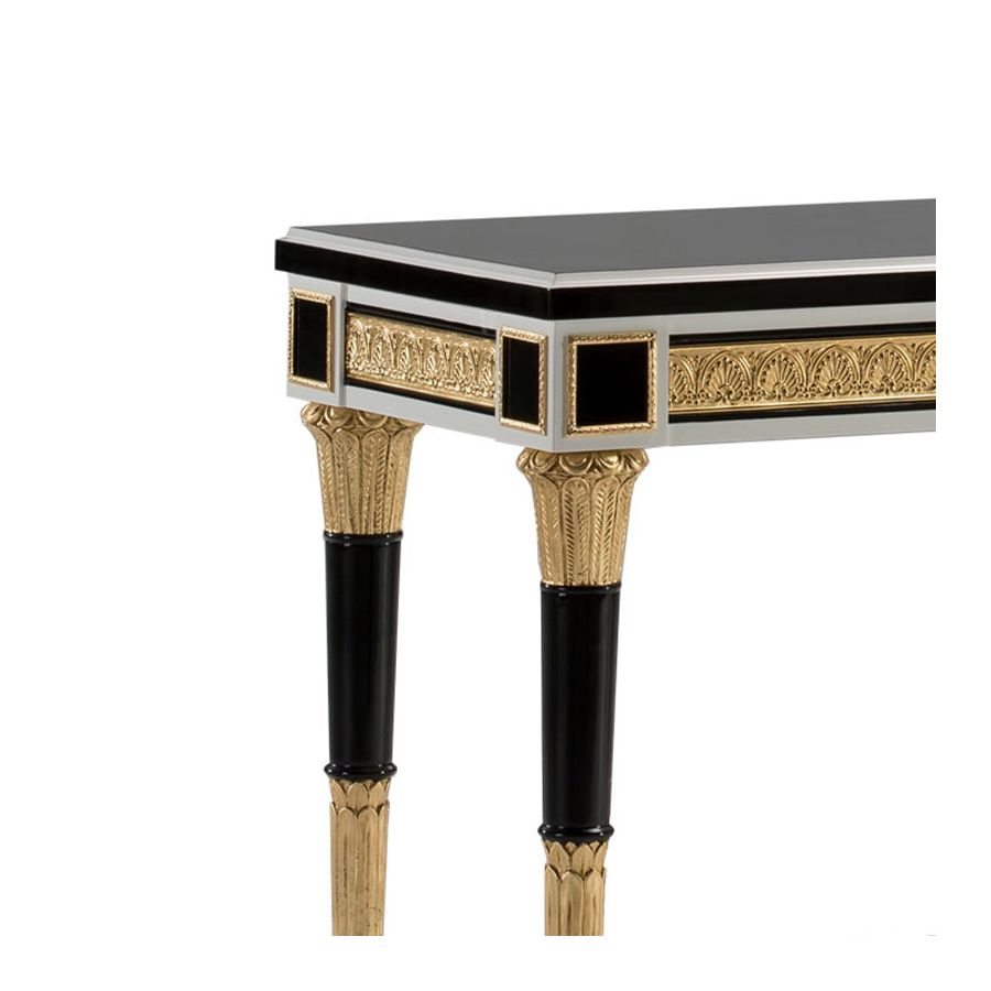 Konsolbordet från Wellington-kollektionen är en neoklassisk skapelse inspirerad av kejsartiden, kännetecknad av bronsornament med en guldfinish, intrikat inlagda bordsskivor, stolar med elegant formade ryggar och hela kollektionen är sniderier dekorerade med antikt bladguld.