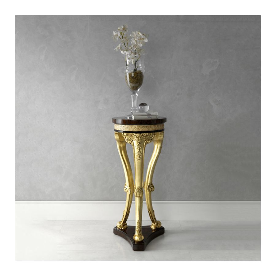 Pelarbordet från VOLGA-kollektionen är tillverkat i valnötsfanér med en elegant dekoration i sykomorträ. Särskilt framstående är den sandgjutna bronsen med antikguldfinish och det snidade träet dekorerat med antikguldsblad.