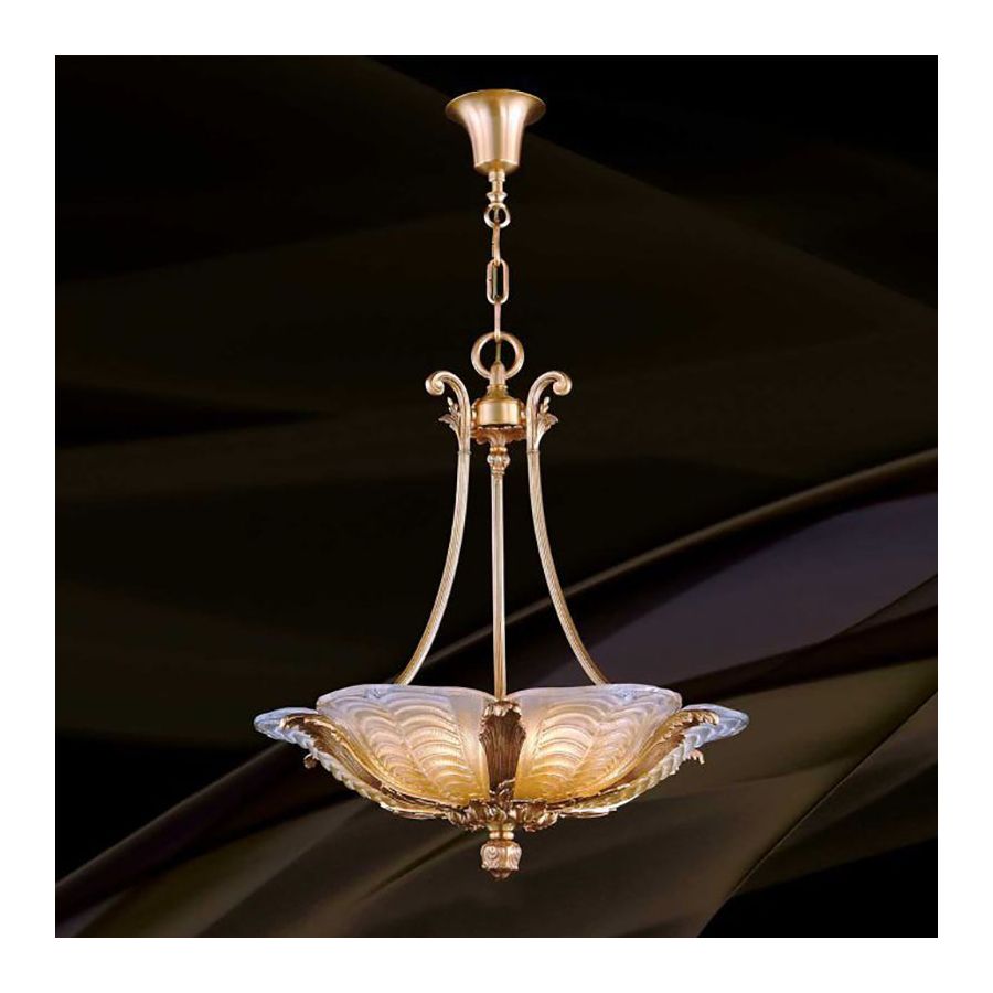 Pendellampa är gjord av gjuten brons och venetianskt glas.
