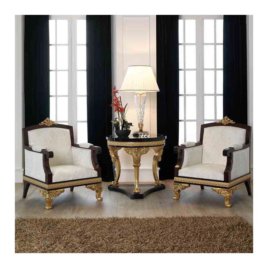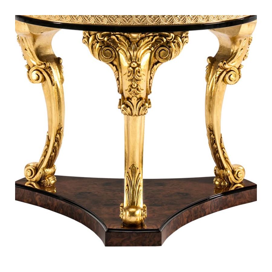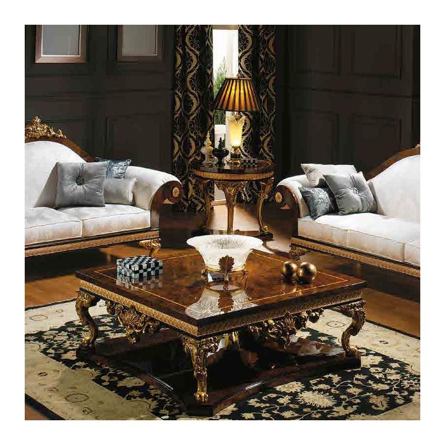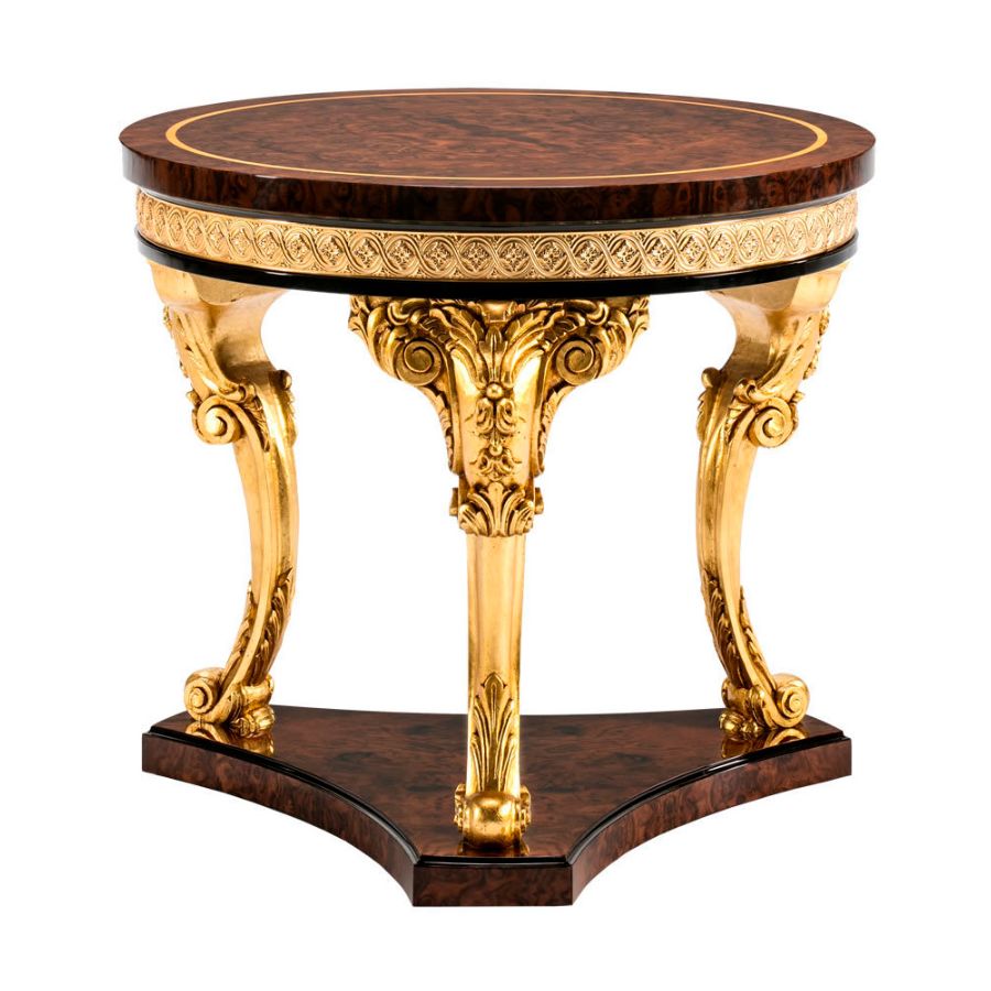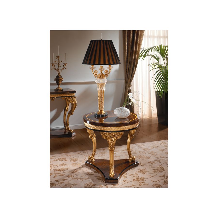 Sidobord från VOLGA-kollektionen är tillverkat i valnötsfaner med elegant dekor i sykomorträ. Särskilt framstående är det sandgjutna bronset med antikguldsfinish och det snidade träet dekorerat med bladguld.