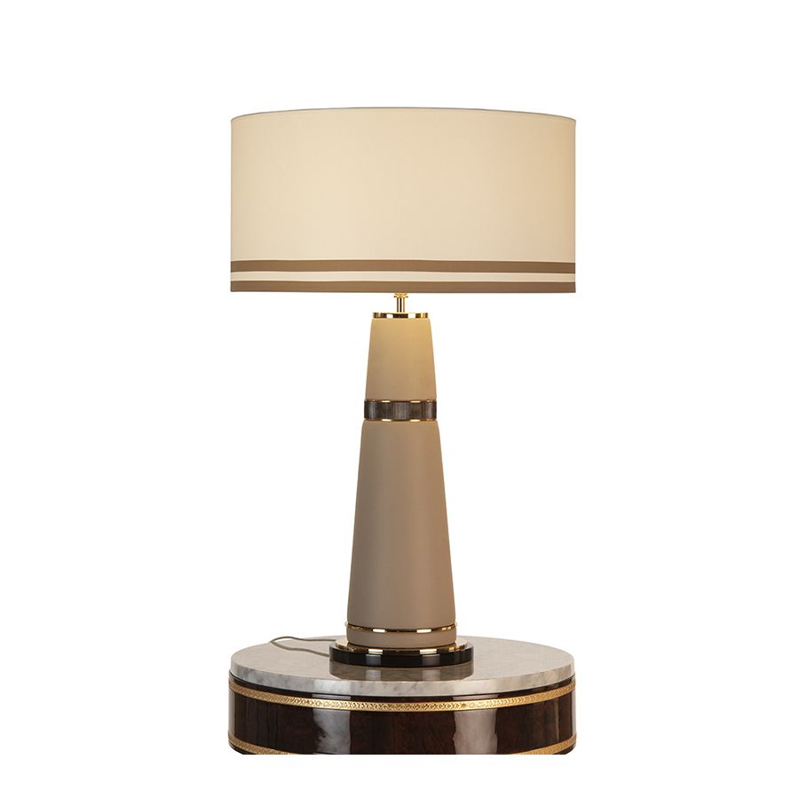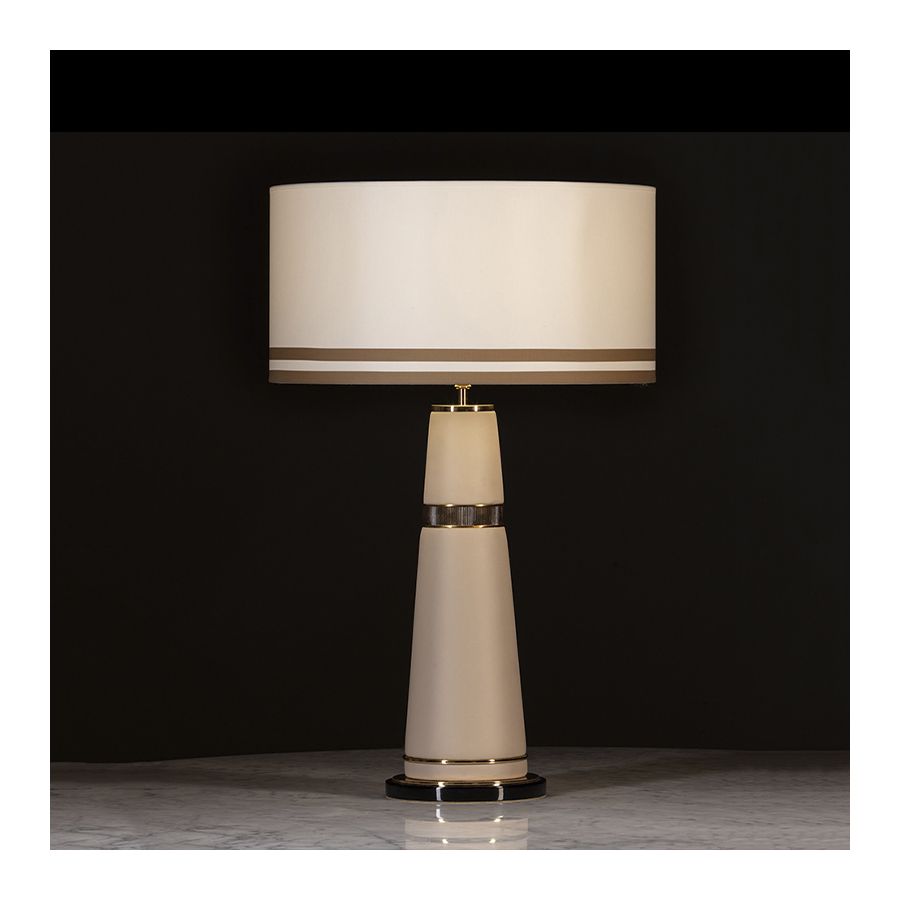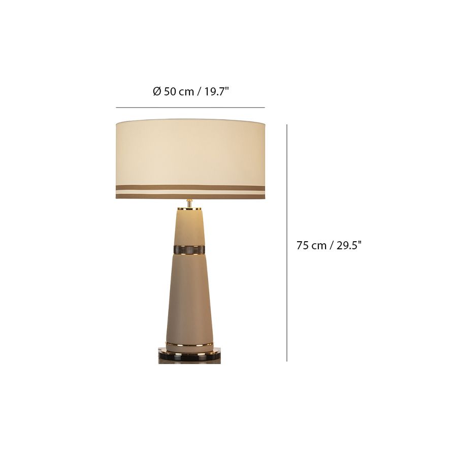 Bordslampa från kollektionen SIN DEFINIR är tillverkad av gjuten brons, läder och tyg.
