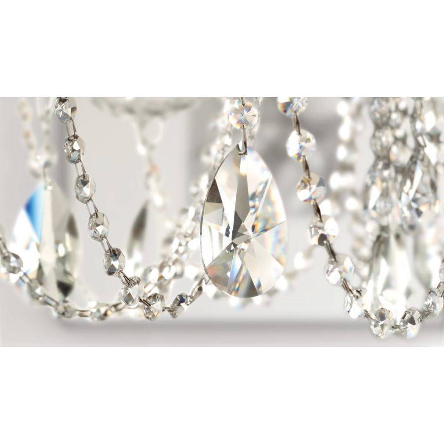 - Metal frame with blown glass arms. Clear glass or clear crystal pendants. Pongee lampshades.