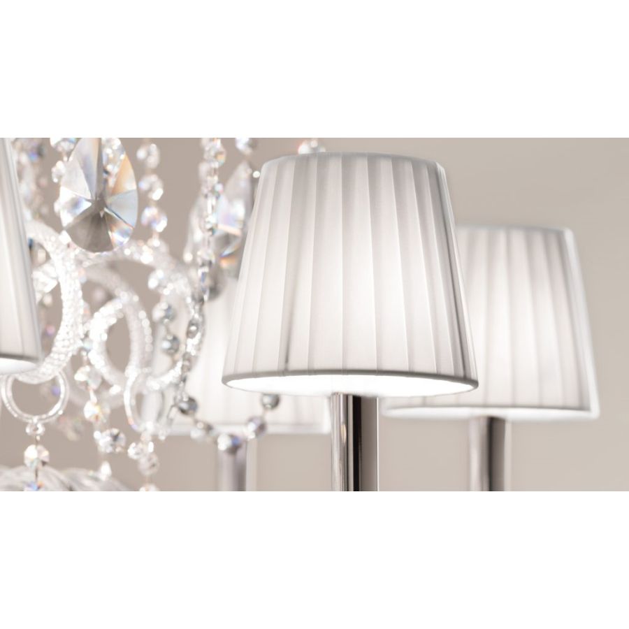 - Metal frame with blown glass arms. Clear glass or clear crystal pendants. Pongee lampshades.