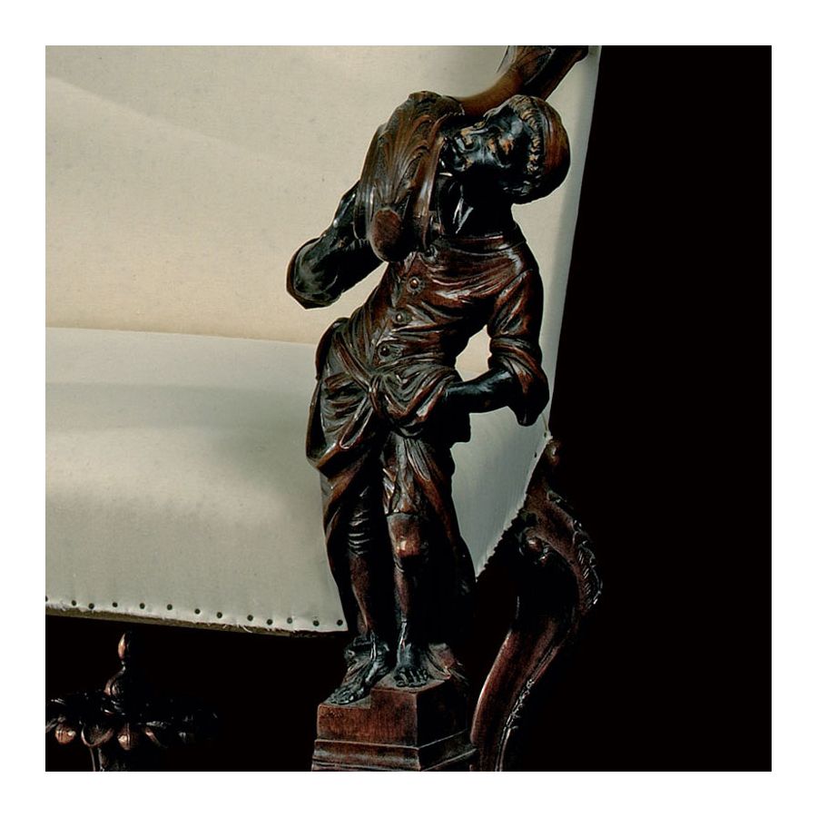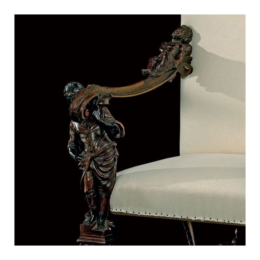 Reproduction of antique model. Venitian Armchair This opulent armchair, in the style fo the Venitian cabinetmaker Andrea Brustolon, is a mystery at the Comédie Française. Has it been on stage, having been around since 1890? There are no clues. Did it perhaps furnish the box of the turn-of-the-century member of the Comédie Française? Whatever the case, this mannerist work of art is quite remarkable and perfectly theatrical. One could easily imagine it gracing a scene from the Merchant of Venice or Othello.