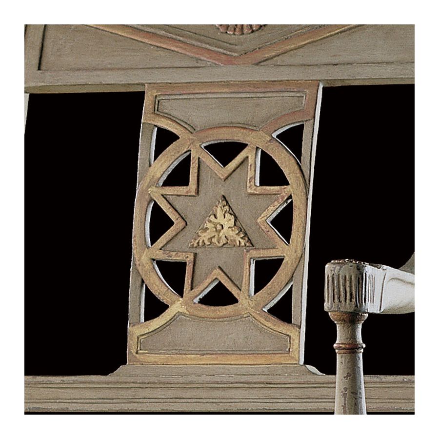 Reproduction of antique model. Directoire armchair, circa 1795. Original: Brussels antiquarian Belgium. A magnificent armchair with splat with openwork star motif, whose highly varied carved decoration (palmettes, stars, lozenges, rosettes, fluting, water lilies, raies de cœur, etc.) allows for many colour combinations. The stiles are en crosse and the sabre legs, scrolled at the top, provide solidity in an otherwise airy construction.