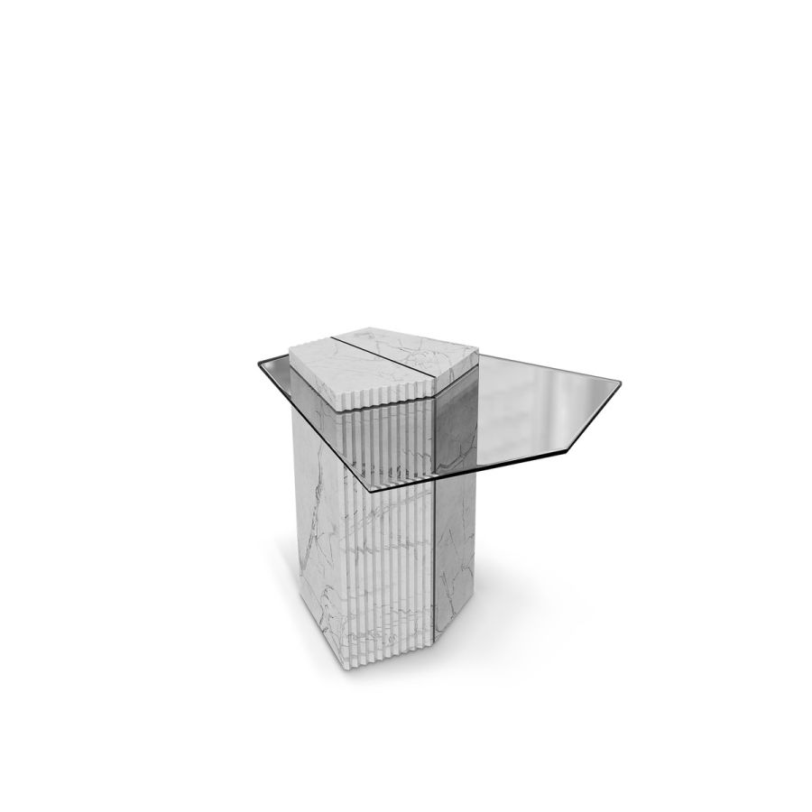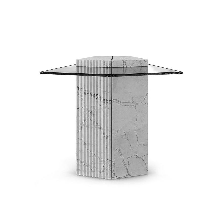 The new Mayer side table was designed as an expression of luxury, combining both marble and glass in an architectural fashion. The veined marble column adds for a classic look while the smoked glass takes on a pentagon shape for an extra layer of detail. This side table is complementary to LUXXU’s namesake center table, a series that spruces up any style of outdoor areas.