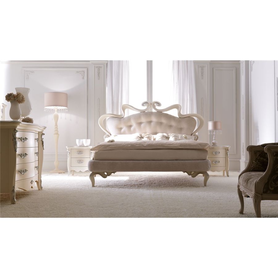 Chest of drawers, bedside tables, tall units, with classical inspiration. The use of carvings on the massive wooden structure, typical of the Renaissance, gives a refined and precious effect.Designed with graceful curves the chest of 3 drawers together with the bedside of same collection, is a romantic and refined solution for every bedroom.