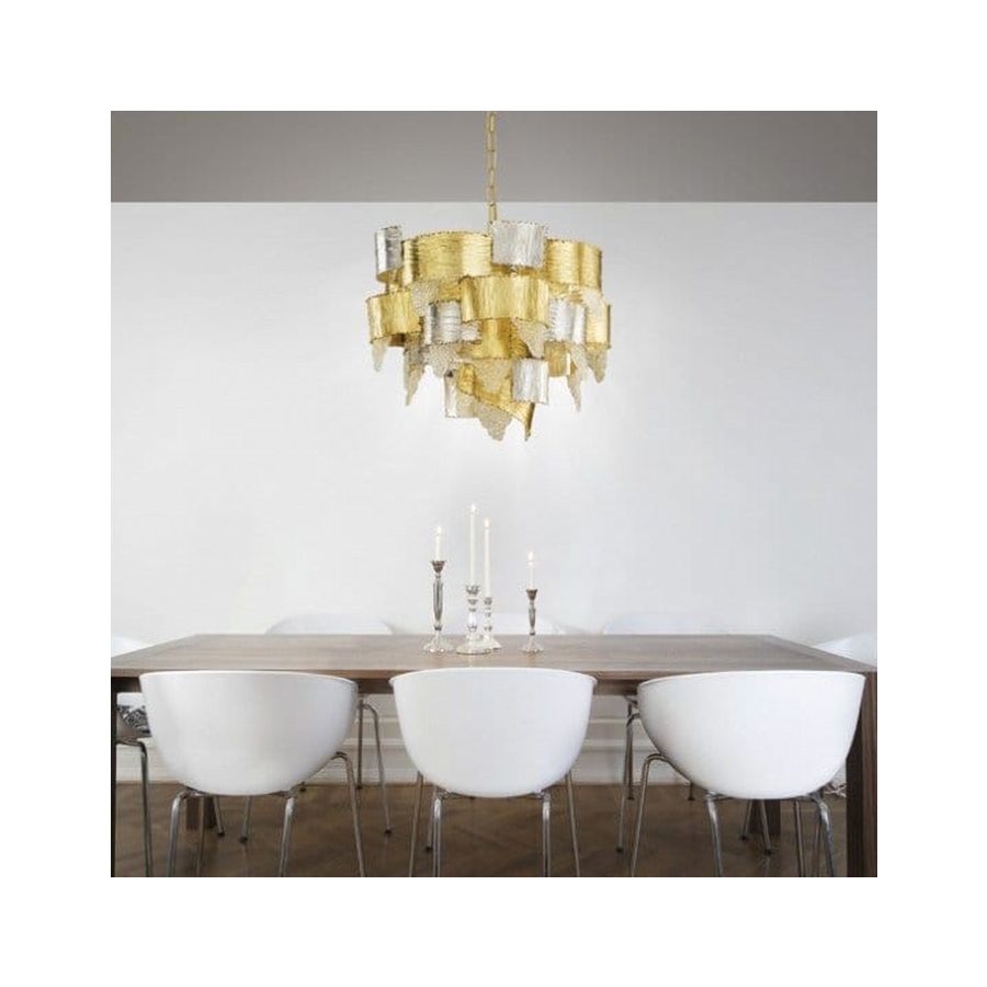 Range city is made with metal sheets of different sizes, mounted to create a round or a square shape. The same sheets are hand worked and decorated in gold and silver leaf. To create a movement and different games of light, the frame is enforced by glass inserts, blown by hand as well.