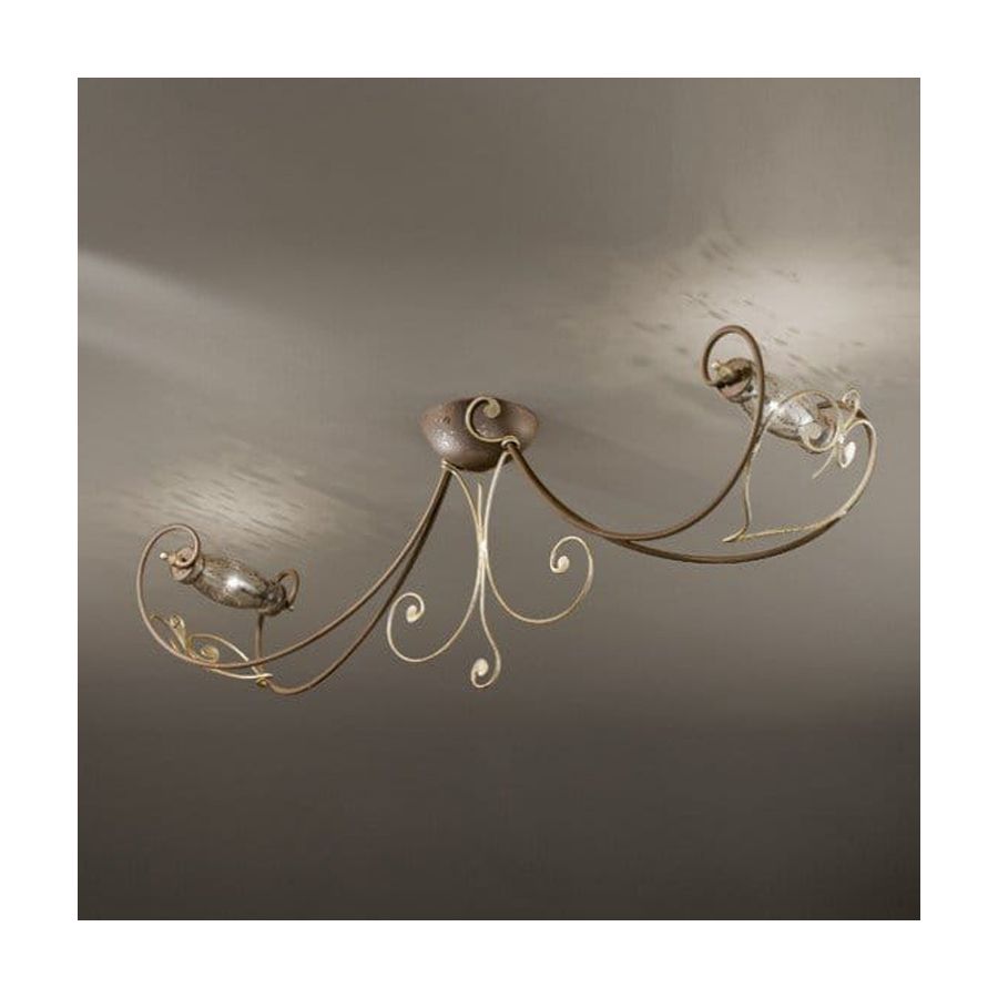 Metal frame decorated with hand-forged details. Hand-blown glass with details that echo the color of the frame make this series youthful and very innovative.