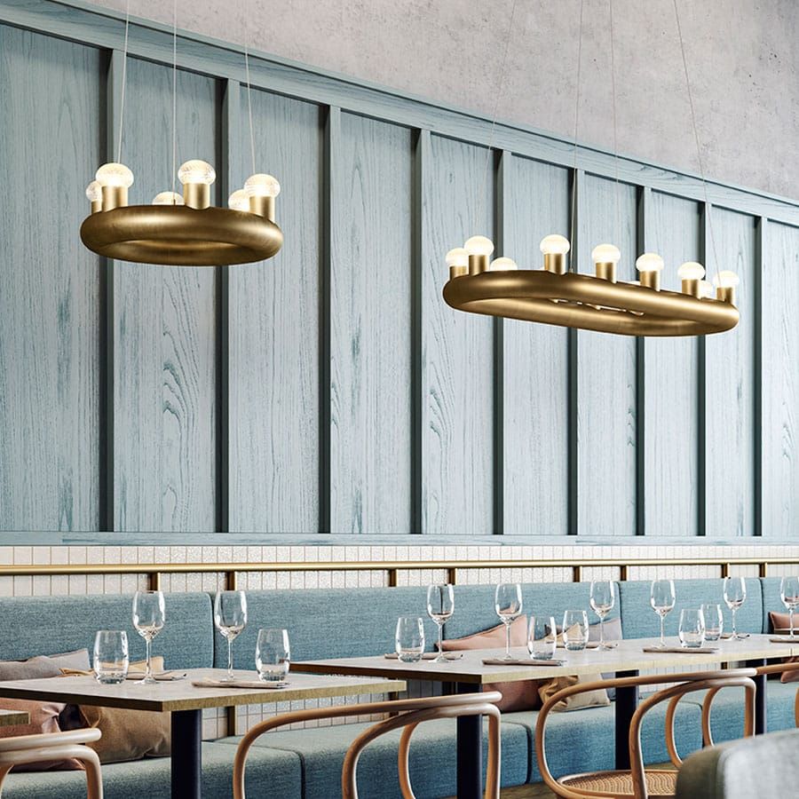 In the Middle Ages and the Renaissance, the lighting of dwellings was obtained using candelabra and oil lamps arranged in a cadence on iron or wood rings. Kingdom is the reinterpretation of this lamp archetype, adapted to the contemporary taste: a simple tubular ring from which emerge, in a repeated and orderly manner, of “technological candles” enriched by a decorative element in worked glass.