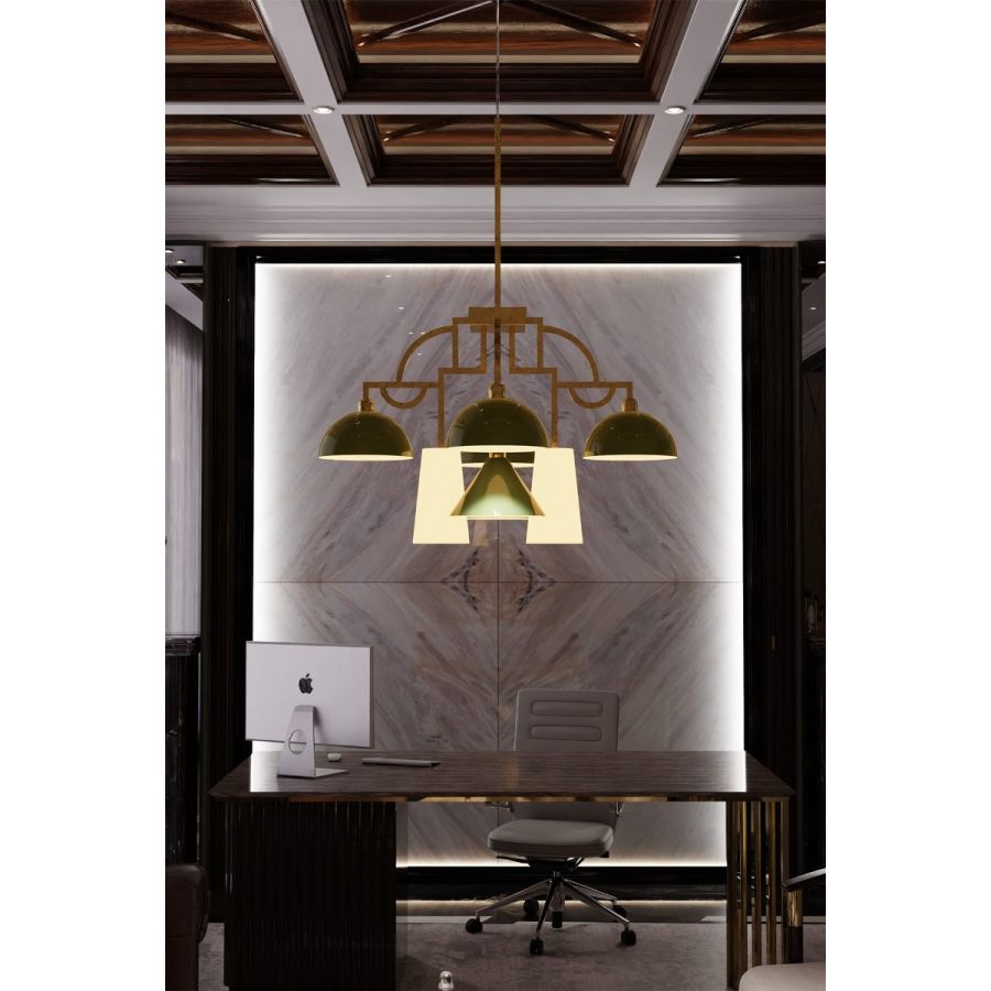 Pendant lamp with metal structure and multiple glass diffusers.
