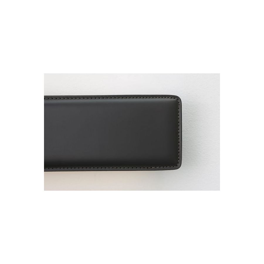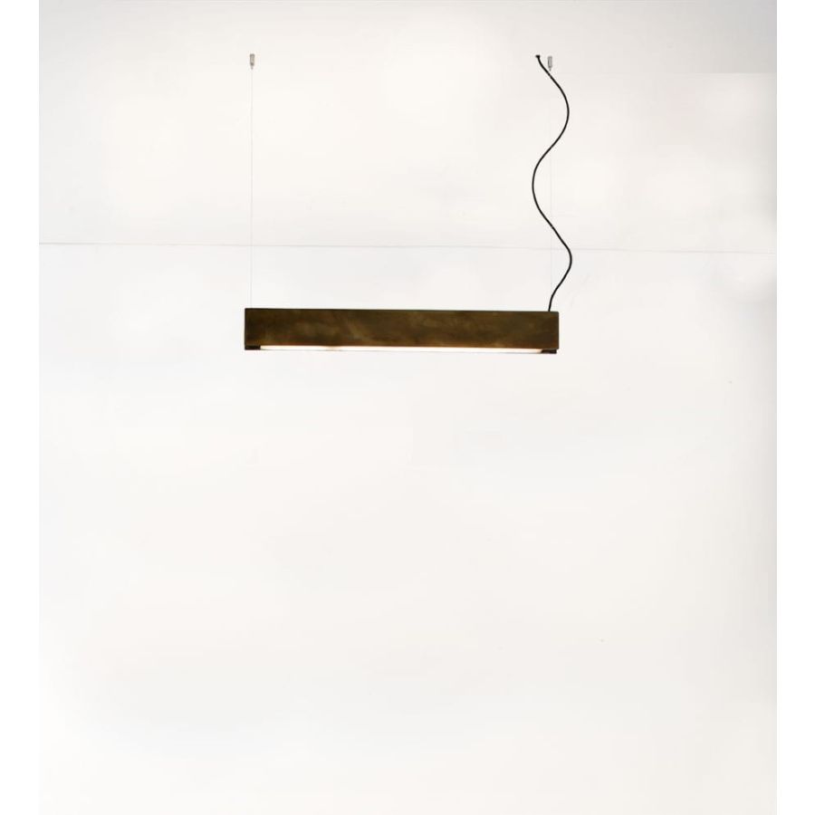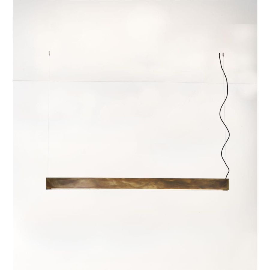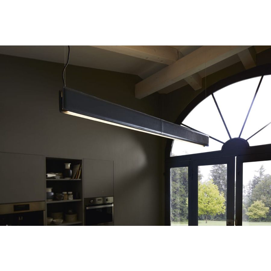 A combination of simple elements gives life to this lamp. Two light lines to illuminate the room bidirectionally and which can be switched on independently. Easy-to-fit covers and striking colours that leave their mark. It is available in the raw finishes of acid-etched brass and pickled iron or with black leather upholstery for a more elegant effect.