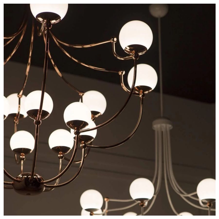 This chandelier is the new interpretation of our Luna lighting presented in early 2000s, aiming at semplicity and removing every redundant elements. Only the “soul” of Luna has been left intact, emphatizing its junctions and glass shades to get a balanced image.
