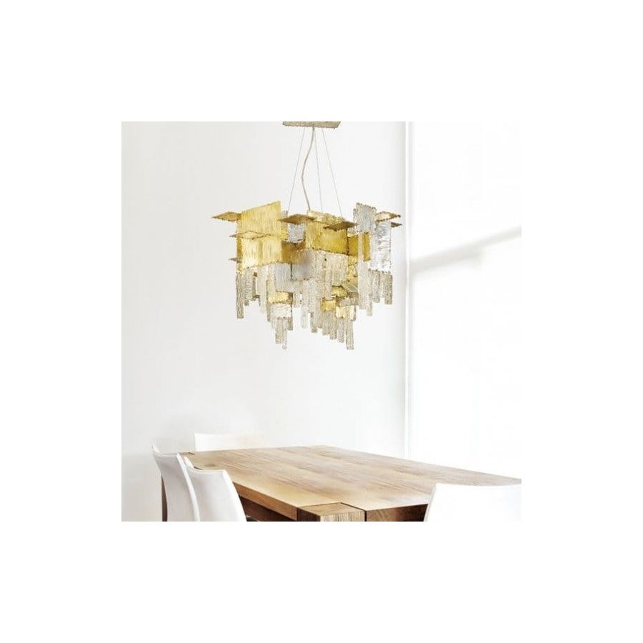 Range city is made with metal sheets of different sizes, mounted to create a round or a square shape. The same sheets are hand worked and decorated in gold and silver leaf. To create a movement and different games of light, the frame is enforced by glass inserts, blown by hand as well.