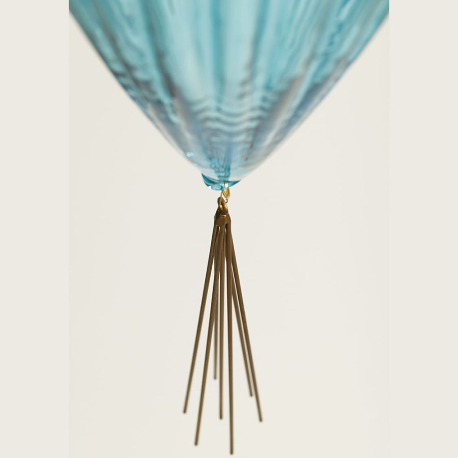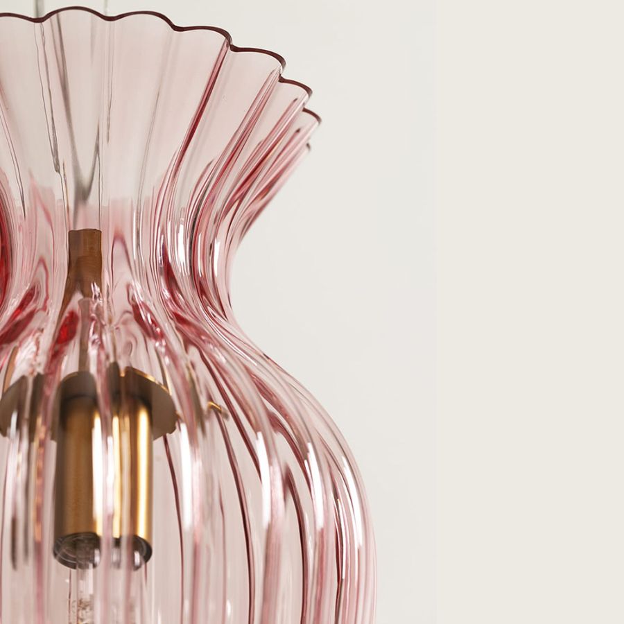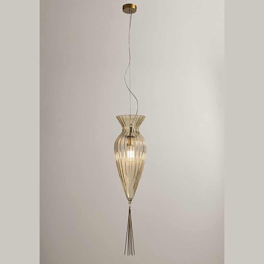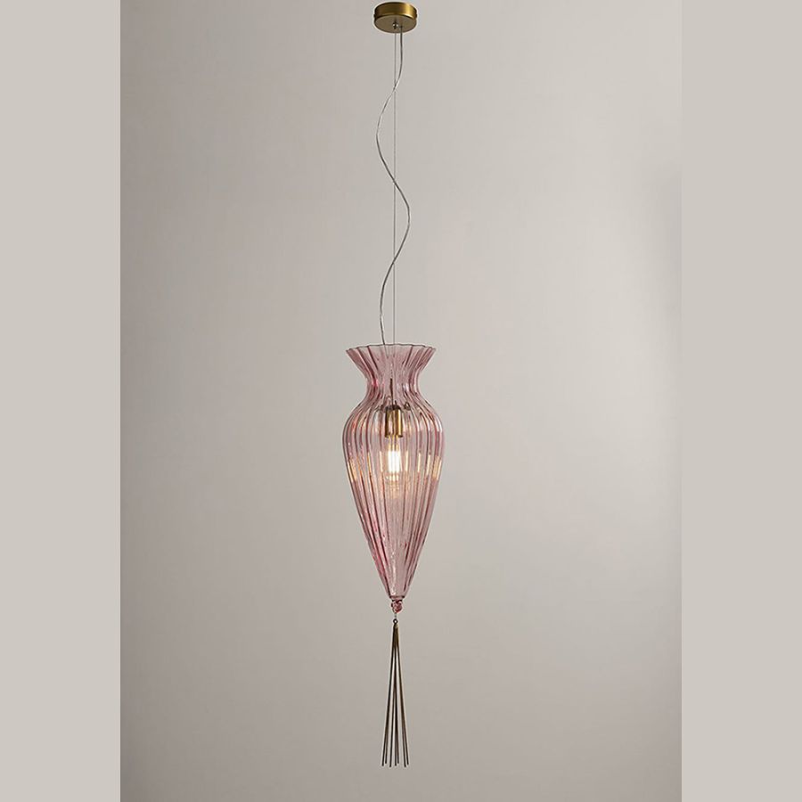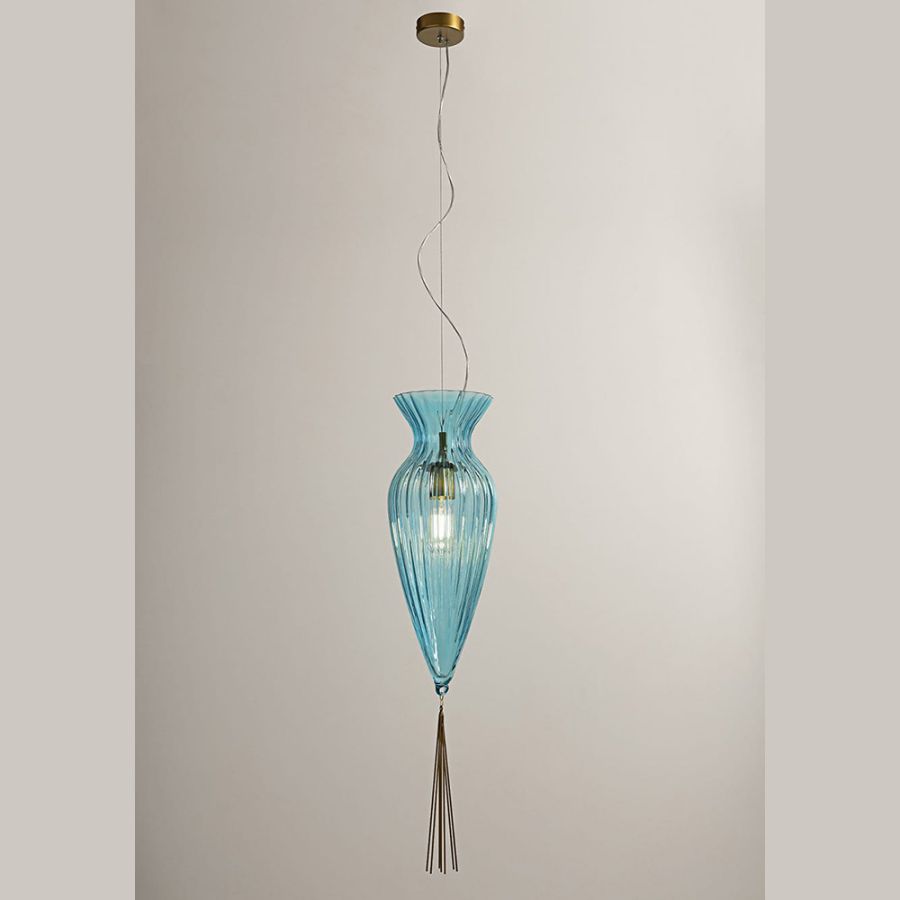 Suspension with one light realized with hand-blown glass as per tradition of glass masters of murano. The lamp is completed with a metal drop that makes it smooth and slender.