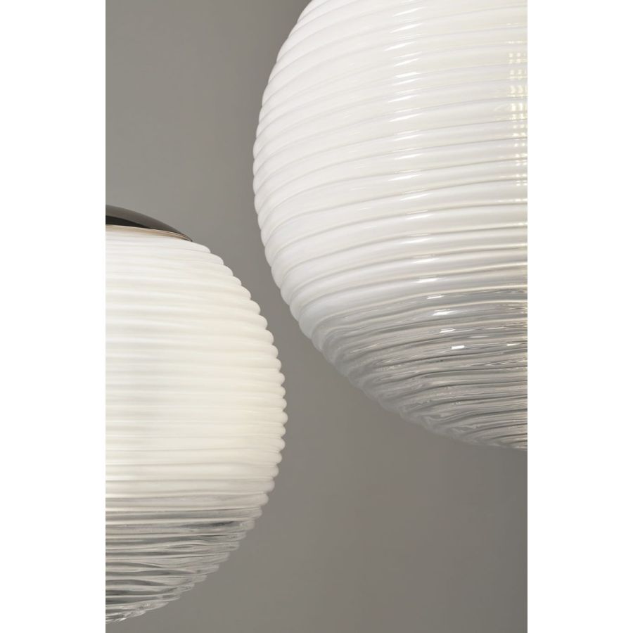 The timeless spherical shape reinterpreted with a compact wave surface that enhances the dissemination of Light. The family includes pendant lamp in two sizes, table lamp and floor lamp. Diffuser in Murano white shaded milk glass and painted metal structure.
