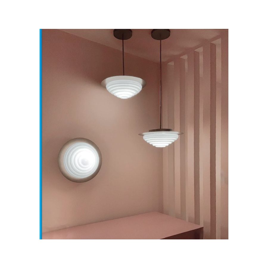The sinuous concentric waves of Murano glass recall the surface movement of water, distributing light evenly. A metal disc frames the shapes highlighting them and directing the light to the plane below.