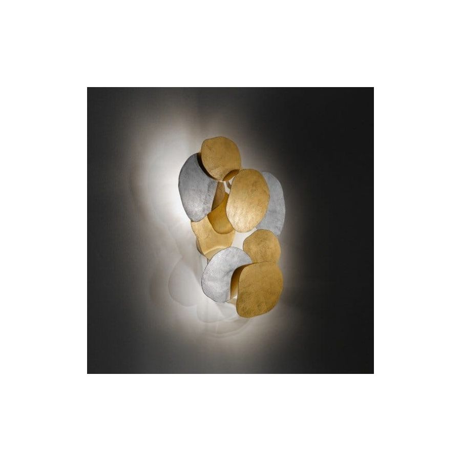 Lamps that can be used as ceiling or wall lamp; realized with metal sheet, positioned to create almost a sculpture, and finished in gold and silver leaf.