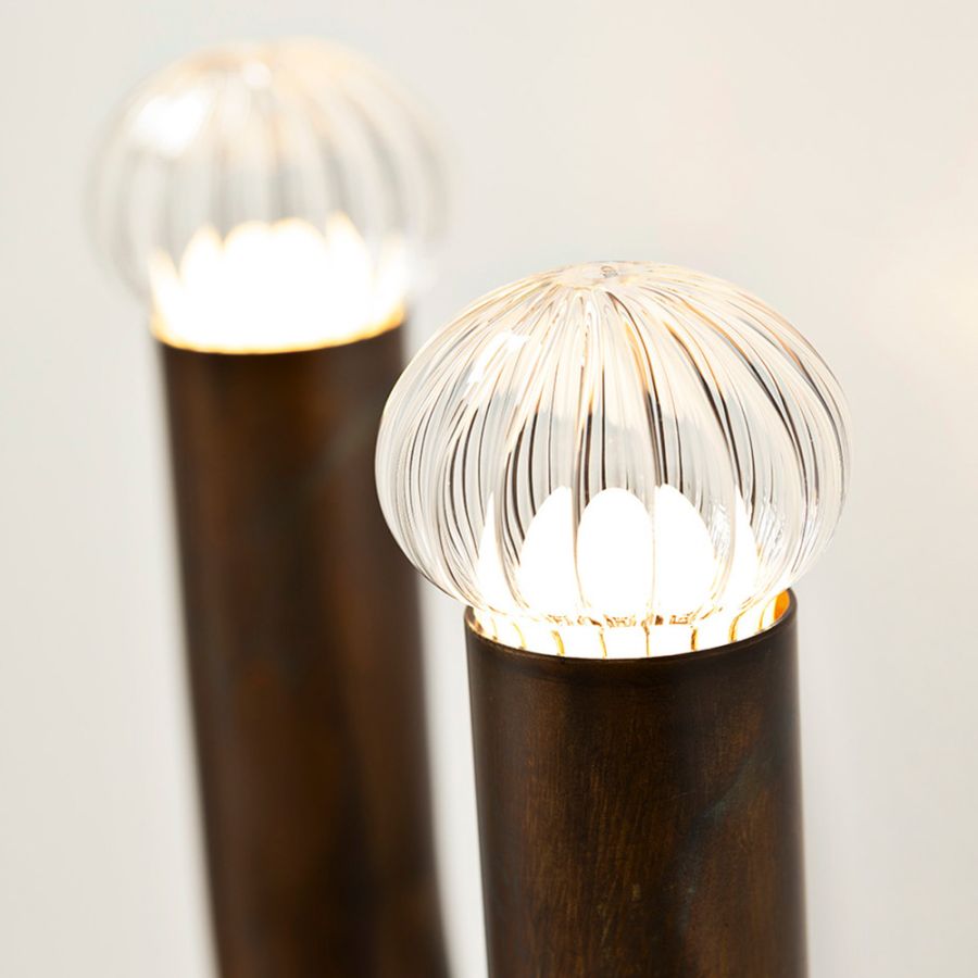In the Middle Ages and the Renaissance, the lighting of dwellings was obtained using candelabra and oil lamps arranged in a cadence on iron or wood rings. Kingdom is the reinterpretation of this lamp archetype, adapted to the contemporary taste: a simple tubular ring from which emerge, in a repeated and orderly manner, of “technological candles” enriched by a decorative element in worked glass.