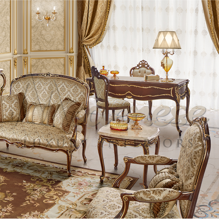 A chic beige classic armchair from Modenese Furniture Luxury Interiors is a type of chair that features a timeless and sophisticated design that is both stylish and versatile. It is typically upholstered in a beige-colored fabric, which gives it a neutral and understated appearance that can complement various decor styles.