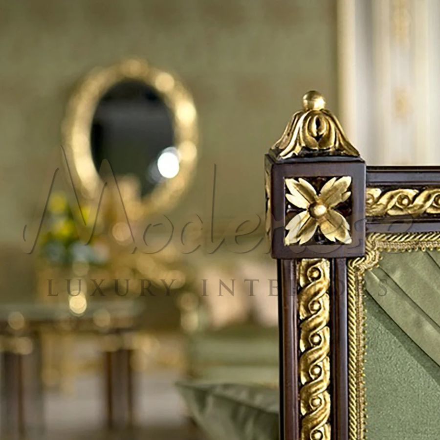 A classic luxury armchair in timeless emerald green upholstery. Neatly crafted with the finest quality fabric on the dark solid wood frame, finishing with the exquisite golden decorative in an exceptional Modenese design. A great accent piece to elevate the ordinary living into an elegant luxurious space. The armchair is a unique piece on its own but in a set, it will bring a much glamorous atmosphere.