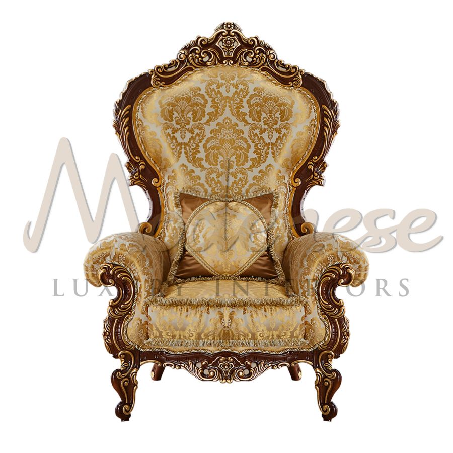 A majestic venetian armchair in rococo style with luxurious golden leaf upholstery, frame with solid wood, and gold leaf detail. A perfect elegance, throne-like design in your home.