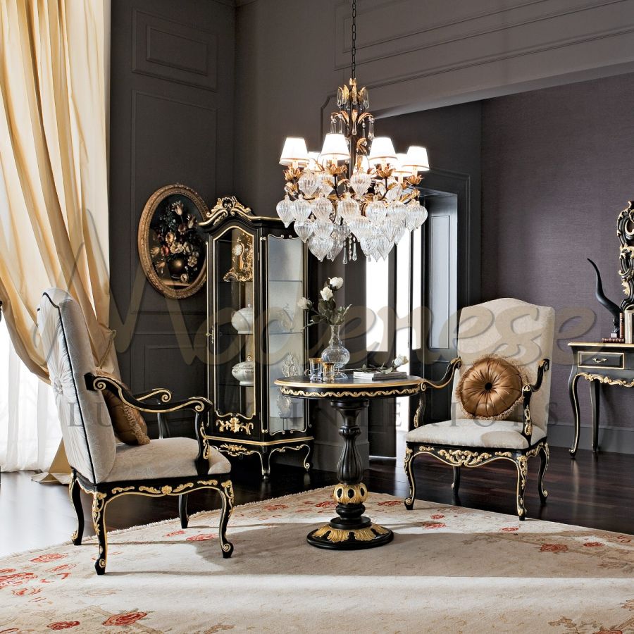 A glimpse to the past, with handcrafted luxury pieces of timeless rococo beauty. An elegant upholstered seating gracefully on top of the contrast black painted carving wooden frame. Beautiful golden decorative details carefully added as intricate accessories to the black frame. This piece of furniture easily brings an elegant touch to your luxury decor scheme. Fabric choice and wooden frame colours can be customised in different options upon request.