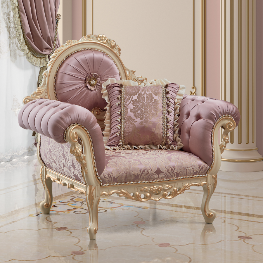 An elegant victorian upholstered armchair from Italian artisans is a type of chair that features a classic and ornate design inspired by the Victorian era. It is typically upholstered in luxurious fabrics such as velvet or brocade and may feature decorative details such as tufting, nailhead trim, or carved wood accents. The armrests of this type of armchair are usually curved and padded, providing support and comfort to the arms while sitting. The backrest is typically tall and may be slightly curved to provide additional support to the neck and shoulders.