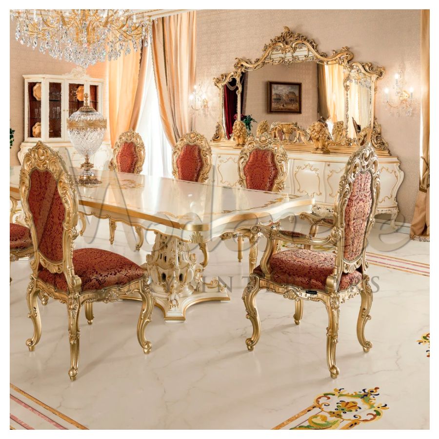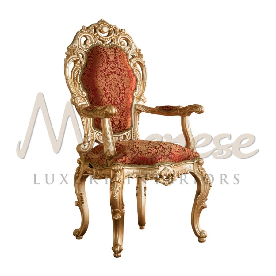 Refurbish your new build mansion with a touch of monarchy by adding one of Modenese Interior's most sold baroque pieces. This dining chair with armrests features wide surfaces of hand-carved squiggle decorations completely finished with gold-leaf applications, plus an upholstered seat and backrest in pattern fabric.