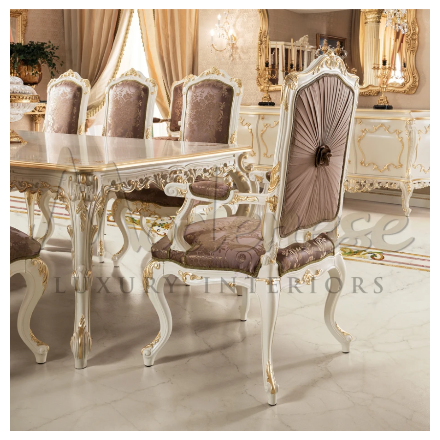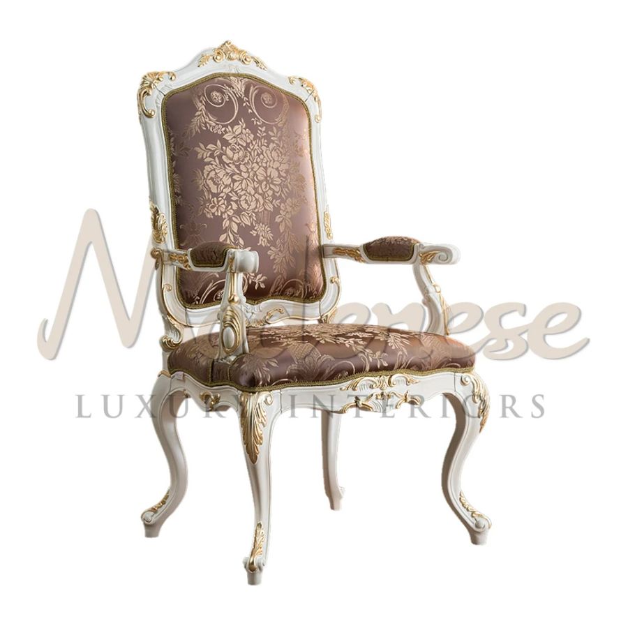 Majestic dining chair with armrest by Modenese Furniture presenting curved baroque legs and precious upholstery. Premium light purple fabric with leaves pattern and gold leaf applique details on a ivory lacquered finish, giving a sense of austerity, power and cleaness.
