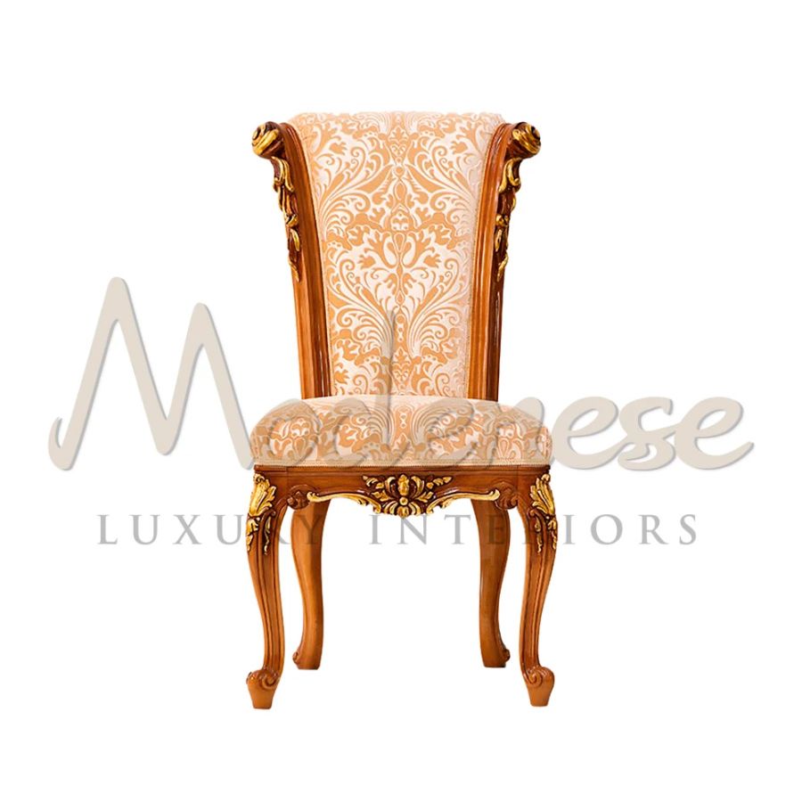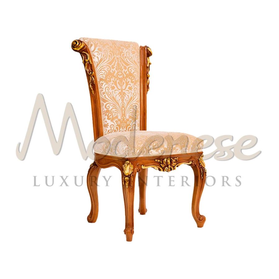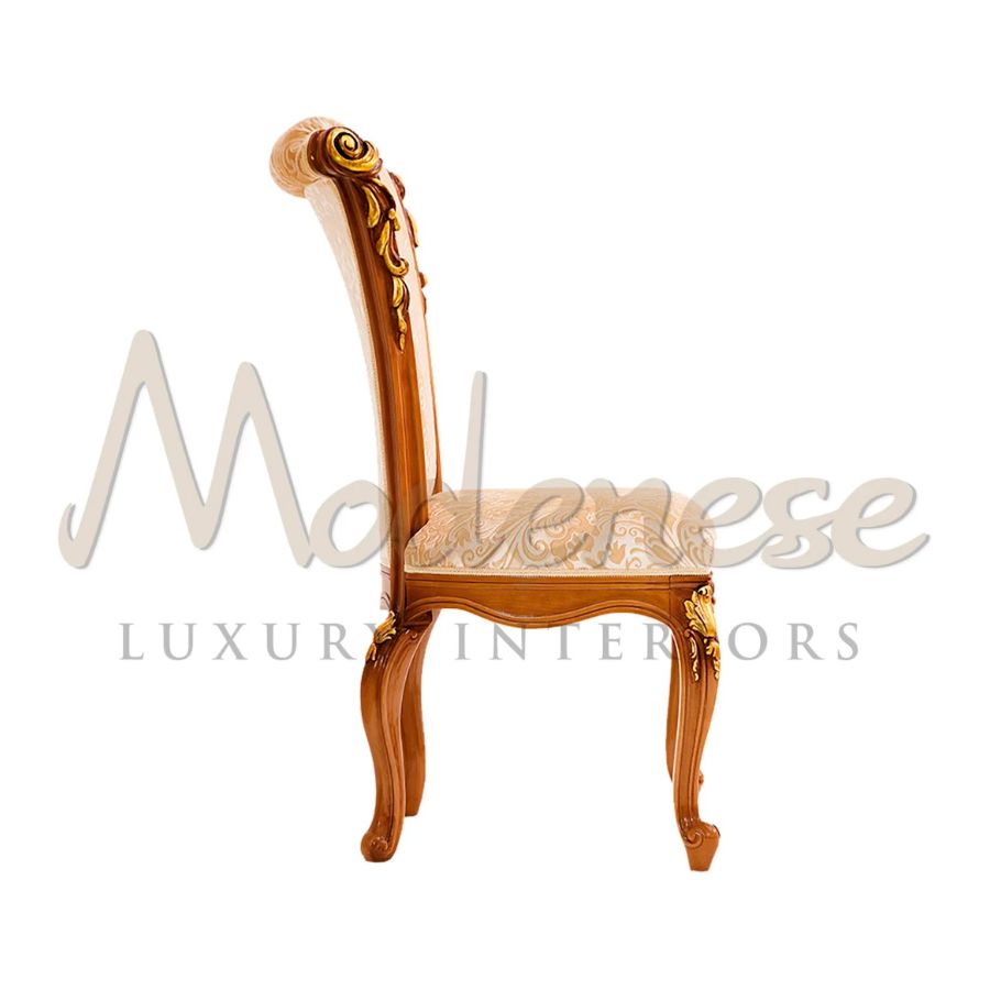 Embellish your dining room with a curved-line neoclassical side chair by Modenese Furniture. This refined seating element, commonly used in bespoke interior projects, presents hand-made gold leaf decorated carved details standing on a light cherry wood finish, plus an ivory velvet upholstered seat.