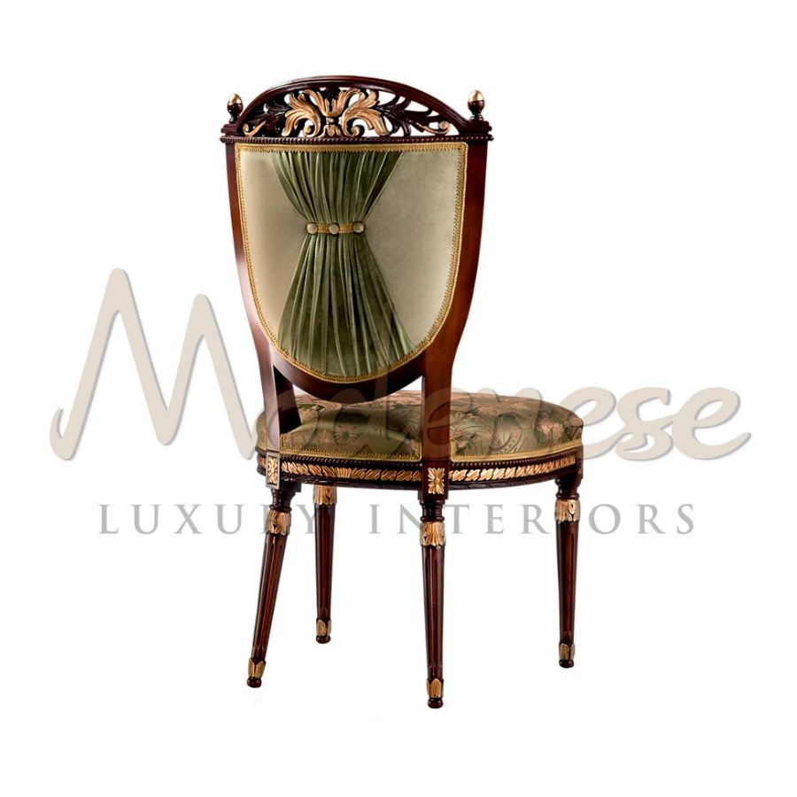 Have a seat on this wonderfully upholstered empire side chair by Modenese Furniture featuring a wood frame gold leaf applied in detail, upholstered with a premium floral fabric in green. What's more? A wonderfully designed fabric decoration behind its backrest.