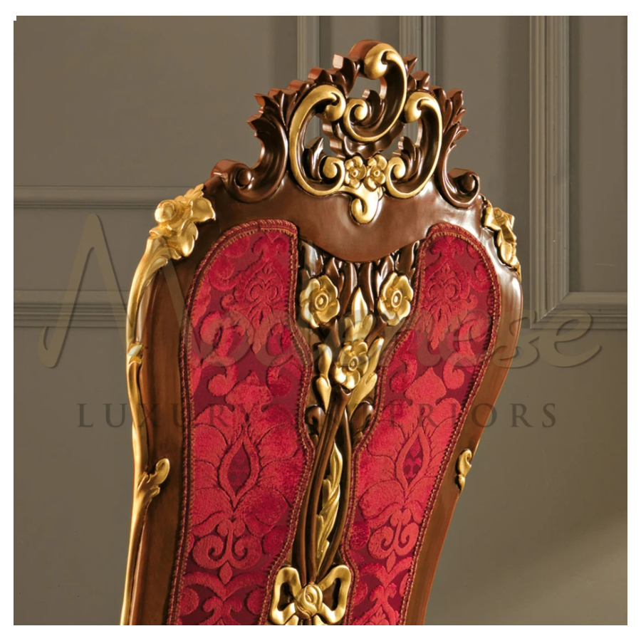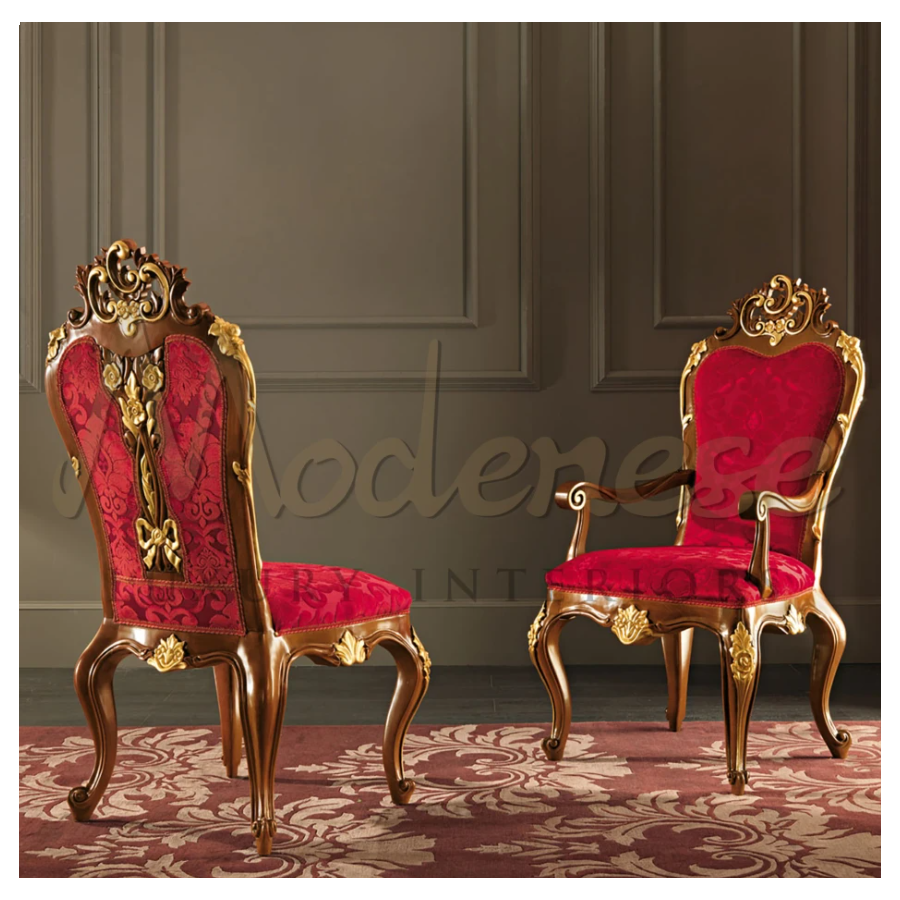 Specially designed dining chair by Modenese Furniture takes on a true baroque style. This wonderful chair is a great head turner piece in any living space with its flamboyant pattern upholstery being highlighted by the solid curved wood frame and the gold leaf decorated carvings.
