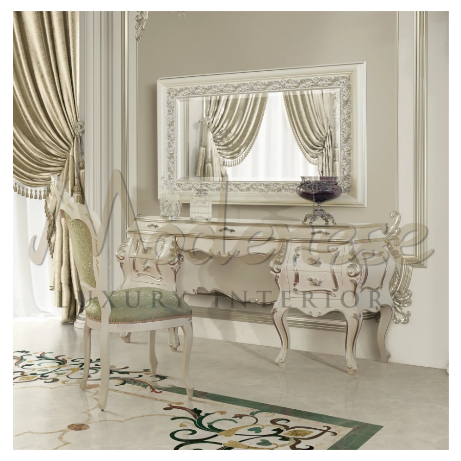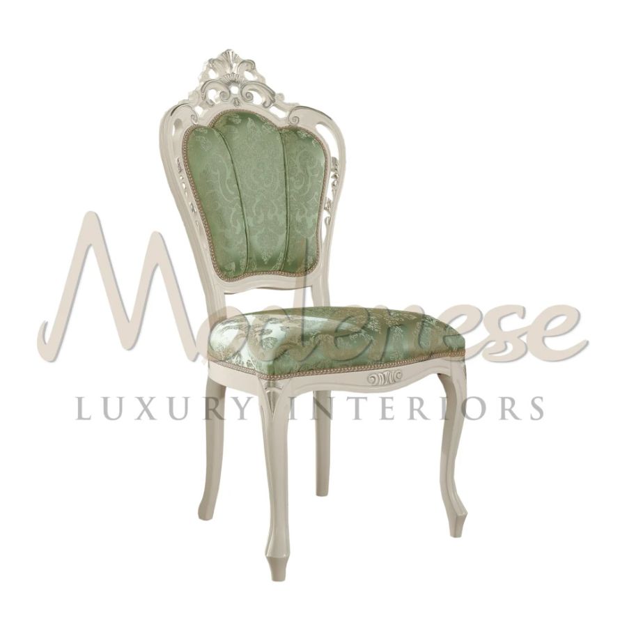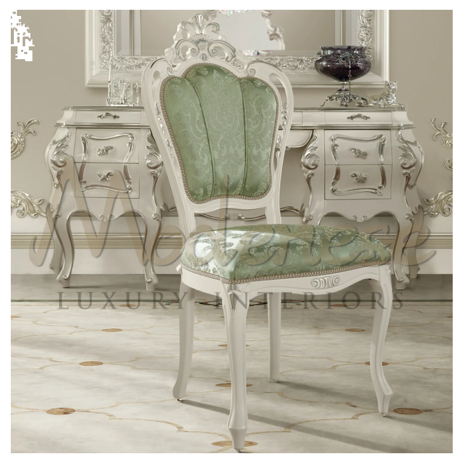 Created by the skilled craftsmen of Modenese Furniture, this chair presents a curved wooden structure with a white finish, silver leaf applications, and handmade carvings. Seat and backrest are padded and upholstered in green pattern fabric, an elegant touch for this baroque-style chair.