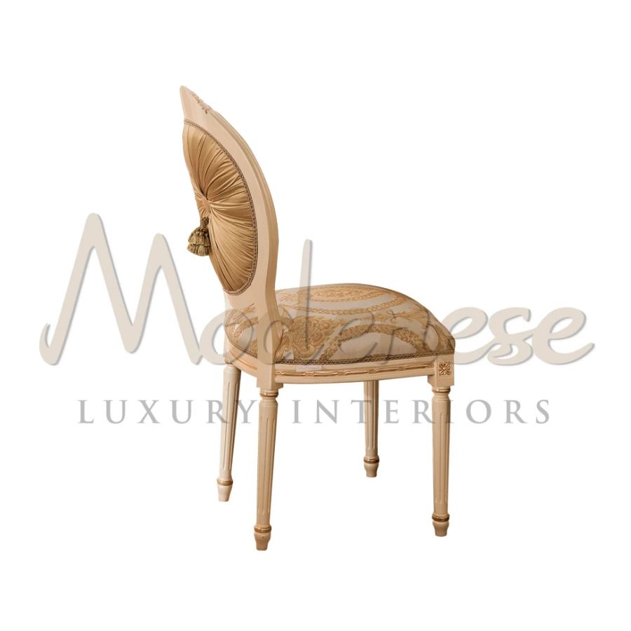 All the preciousness of Italian craftsmanship is wrapped up in this empire-style chair from Modenese Furniture. The frame is in solid wood, while the seat and the back are padded and upholstered in pattern fabric. The backrest, with an external plated fabric, provides an elegant look to the chair.