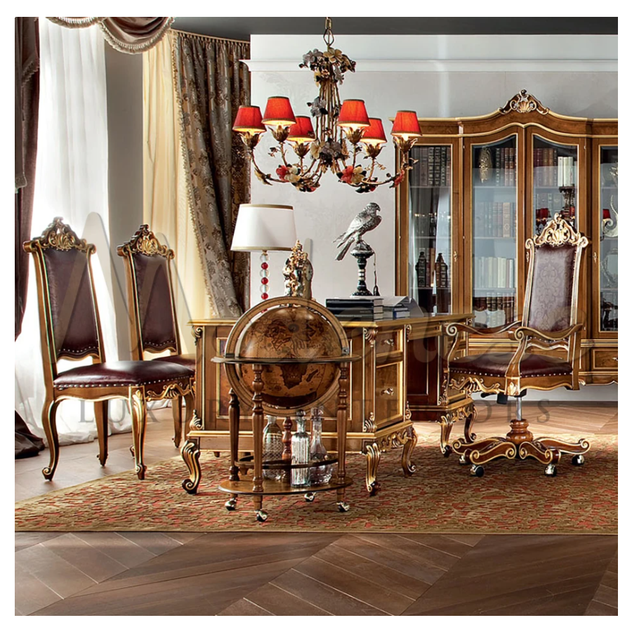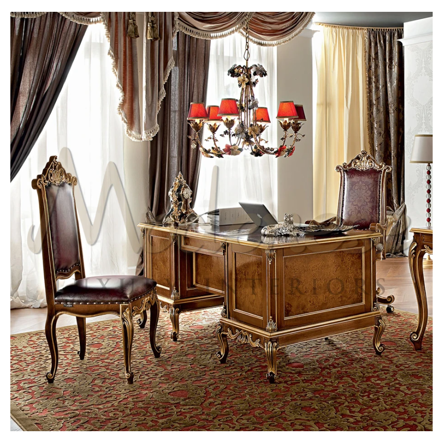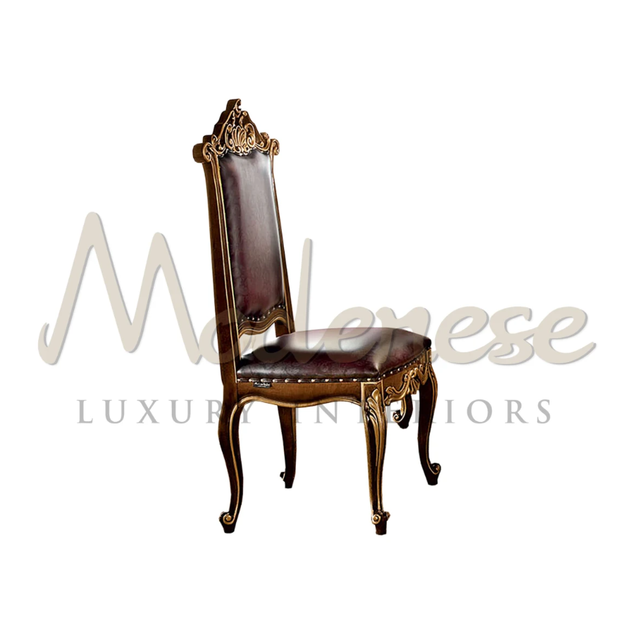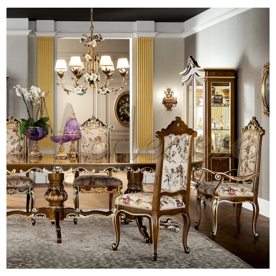 High-end palaces need high-end furniture and Modenese Furniture' mission is to serve this purpose. This majestic shiny dining chair presents a classic walnut finish with gold leaf applications, while the seating cushion and the backrest are upholstered with an ivory-background floral pattern.