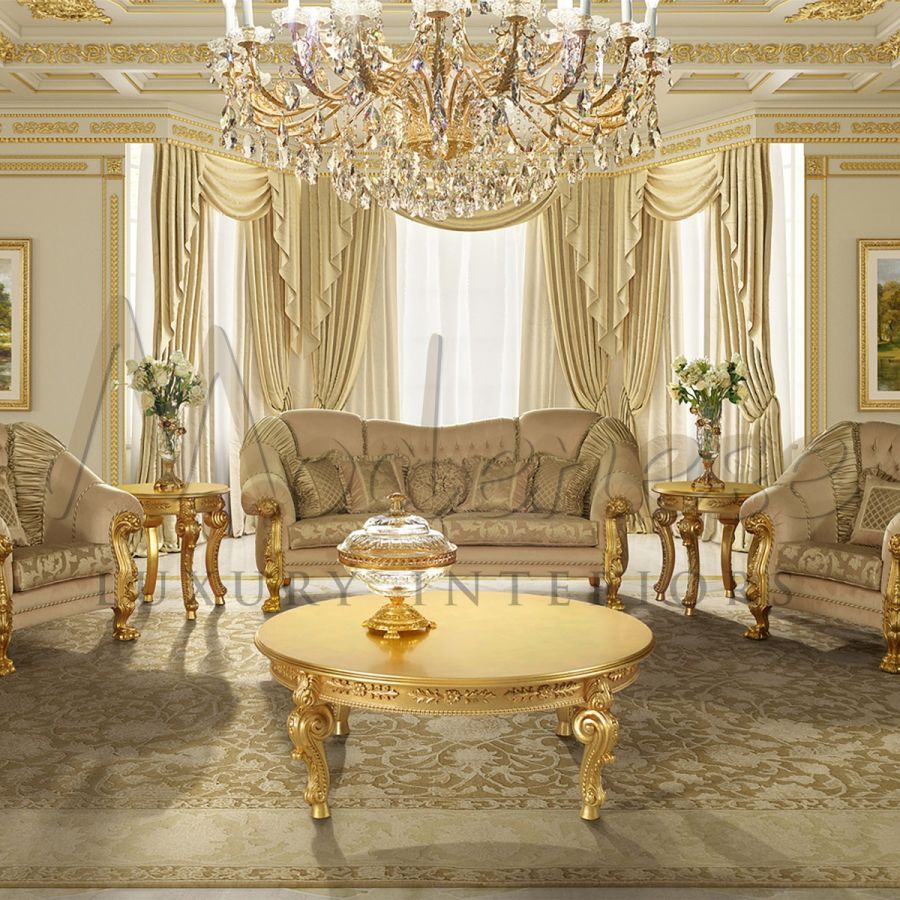 This lavish masterpiece features a resplendent top and structure adorned with the finest gilded 24-carat gold leaf, reflecting unparalleled sophistication and refinement. Each facet of this exquisite coffee table is a testament to the artisanal mastery of our craftsmen. The shimmering gold leaf, meticulously applied by skilled hands, bestows an aura of timeless elegance upon the table, casting a mesmerizing glow that captivates all who behold it.