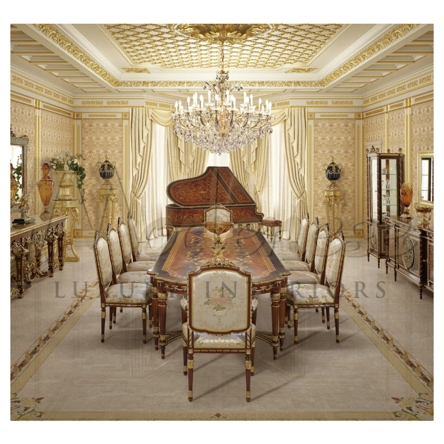 A classic large table, with intricate inlay design top can accommodate a warm gathering up to 10 seatings. Ornate with golden motif details all around the table to enhance the excellency and grandeur presence. The subtle delicacy and nobility exemplified through this table can be easily placed in the room to make the statement.