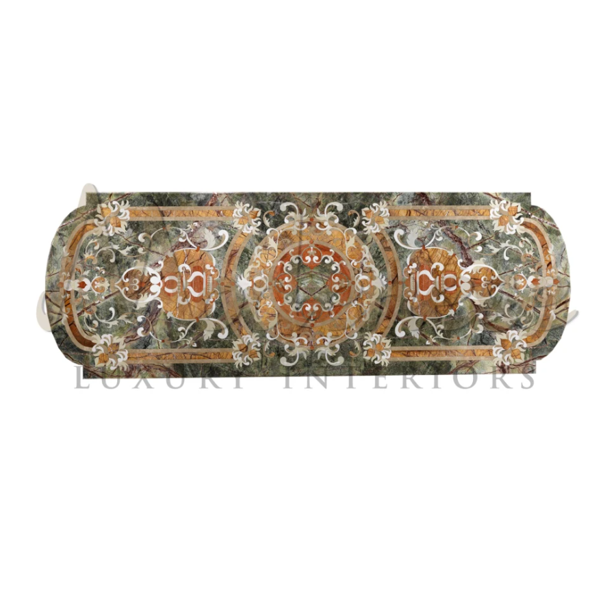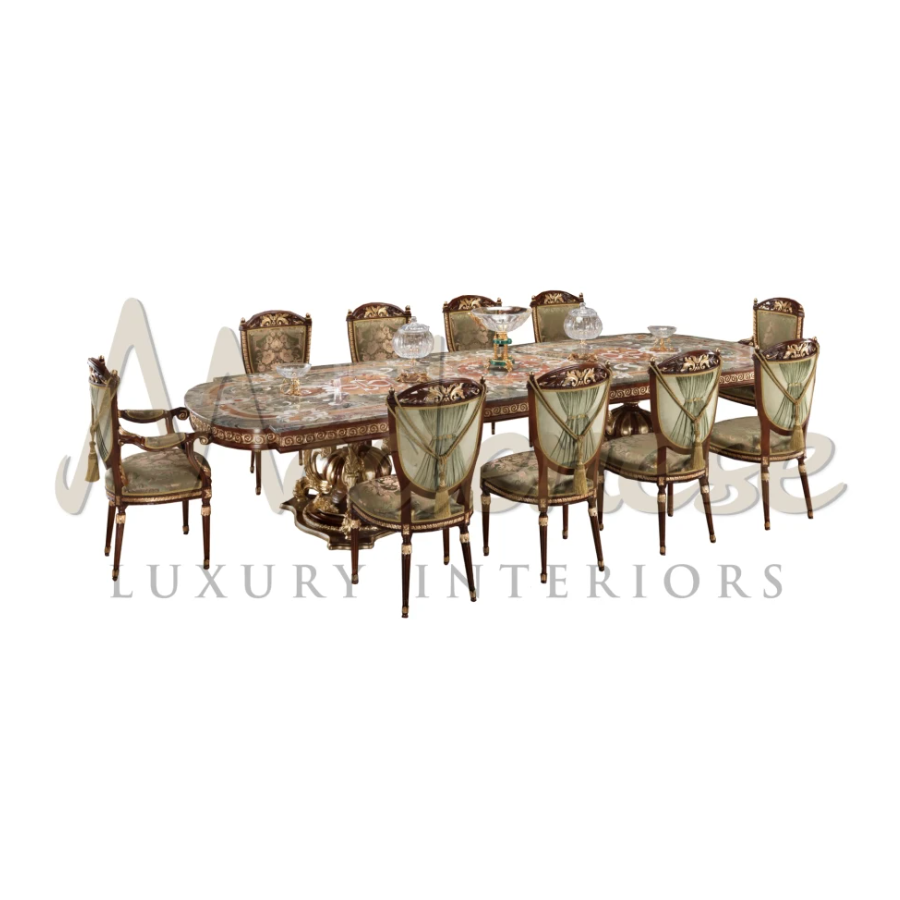 An extravaganza furniture with an excellency of design and handcraft represented in one piece. This luxury inlaid marble top dining table, crafted to perfection over the solid wood base. Hand carved from the highest quality of Italian marble from the best source, uniquely designed by us in house designer and own production. The wooden table base with extra details of curvy wooden motif around the grand pedestals. Perfect to be the centerpiece of your dining room to demonstrate the majesty of design.