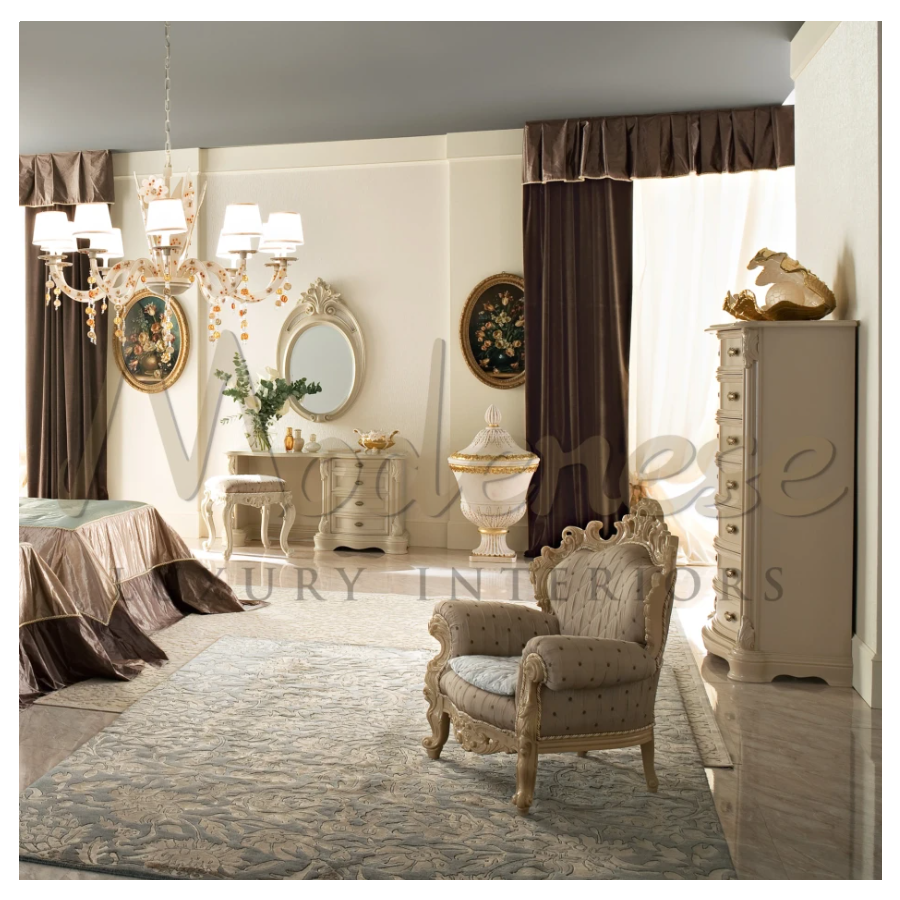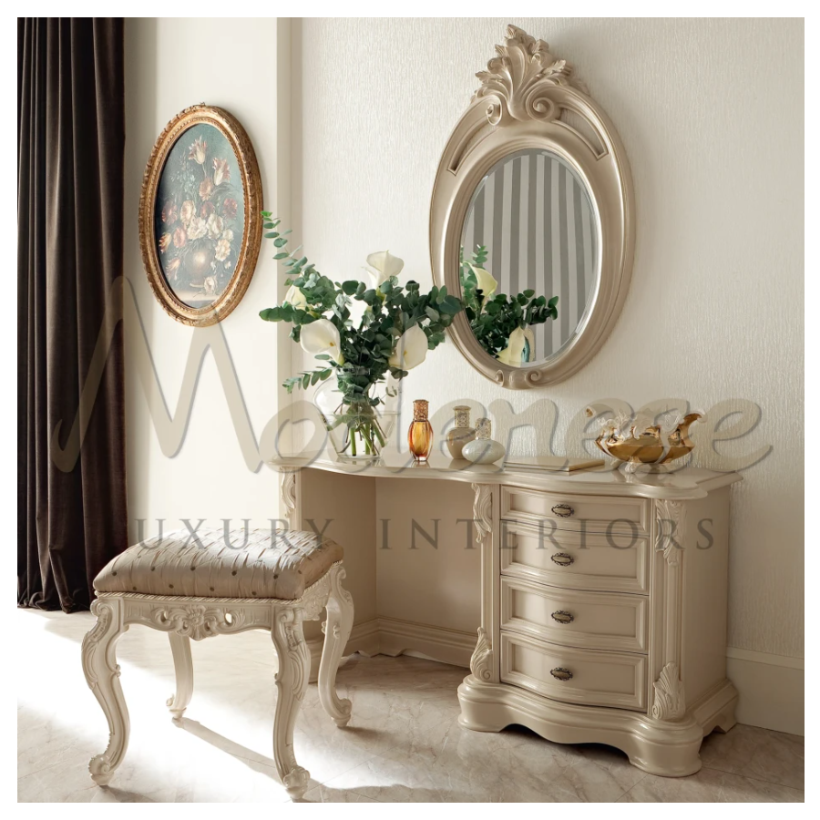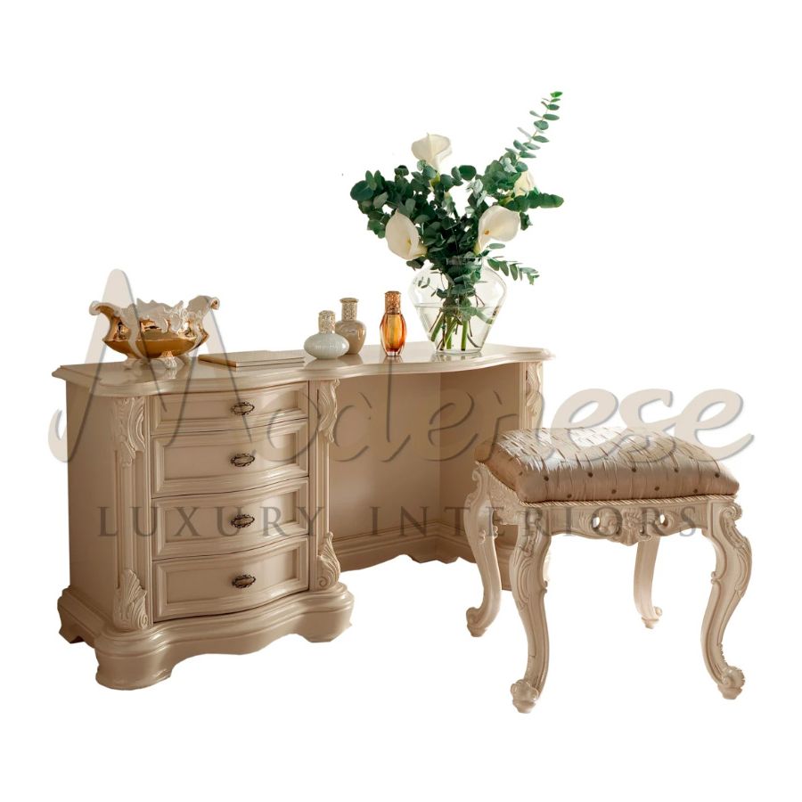 Add a charming touch to your bedroom with this elaborately carved four-drawer (Blumotion soft-closing system) makeup table. Ivory lacquered finishing, premium solid wood structure, luxury knobs: each detail of this piece contributes to the harmonious movement of the overall design.