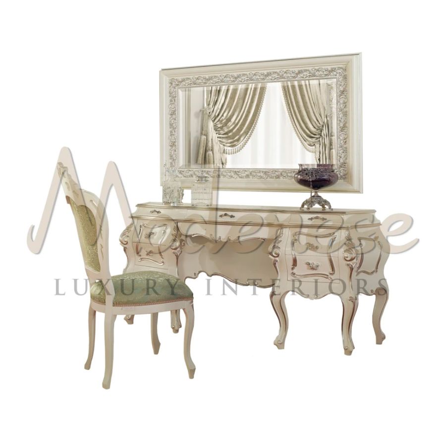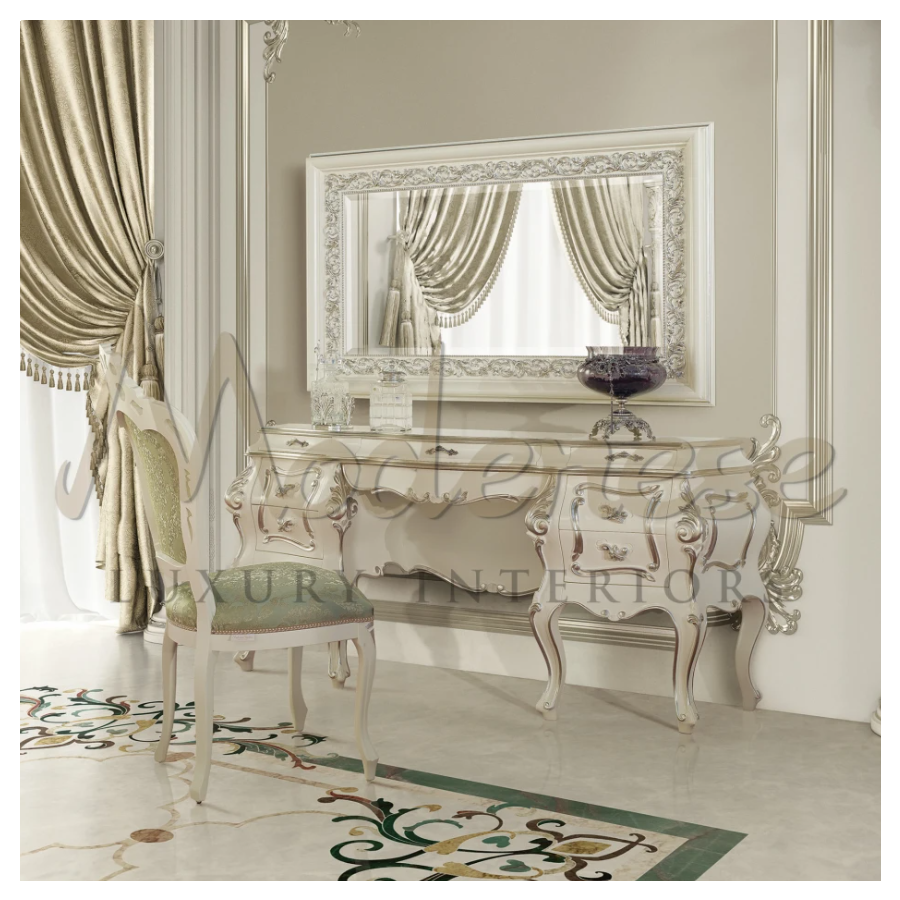 Elegant and majestic white lacquered vanity unit with silver leaf detailed carvings. Wonderfully designed knobs and shape. Modenese Furniture, Italian brand, can also act as a partner for your interior design projects by providing you with planning assistance, bespoke furniture realization and operative installation. This item is usually located in bedrooms and matched with chairs, armchairs, wardrobes, commodes and beds.