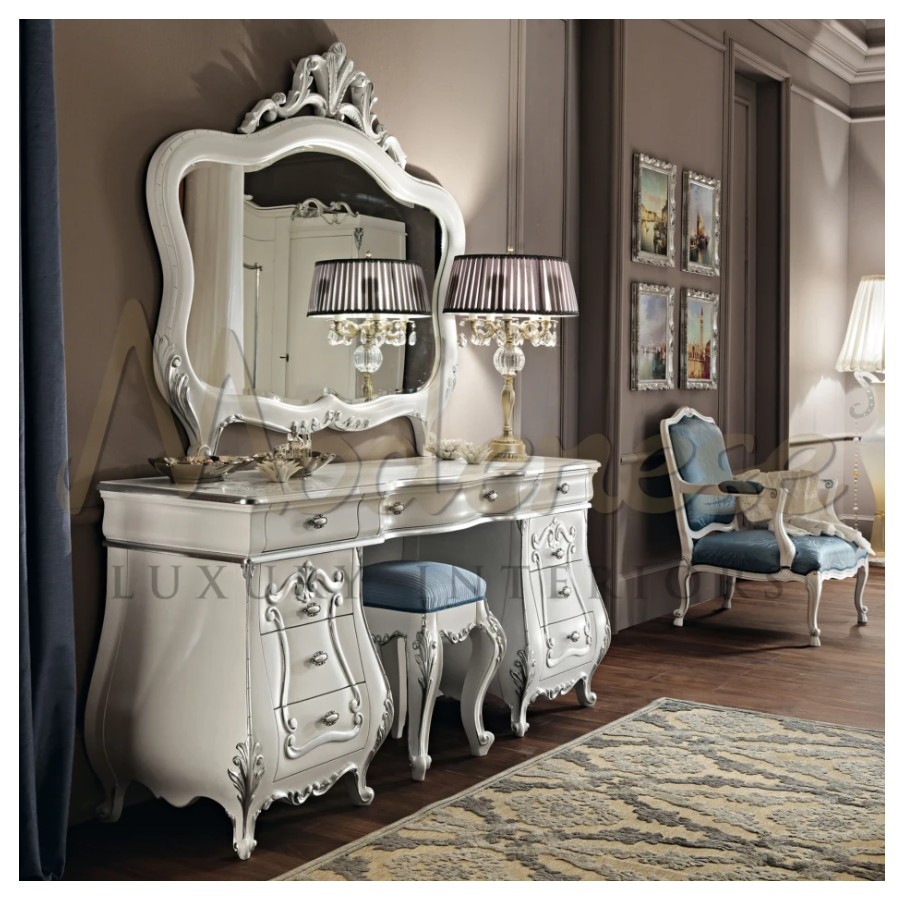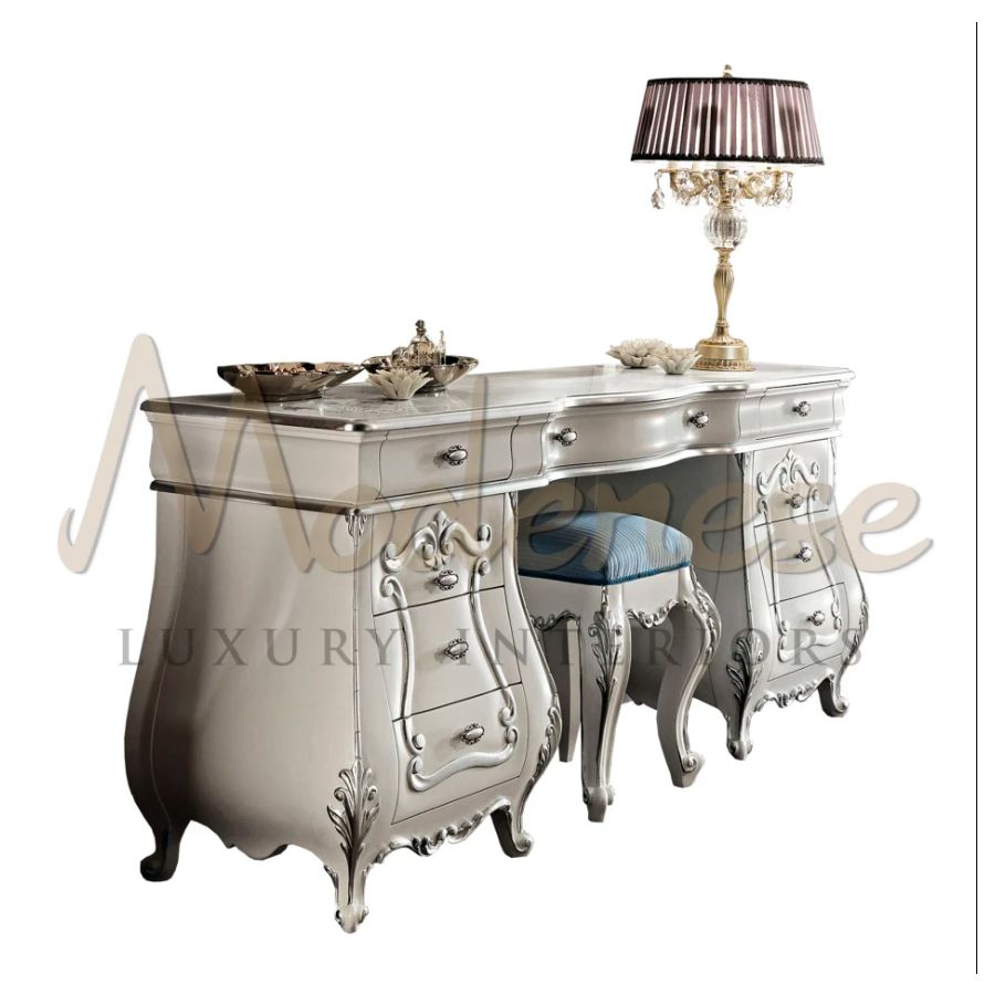 Bespoke baroque makeup table by Modenese Furniture. The unique elegance of this nine-drawer vanity unit is remarcable when we look at its bombed silhouette, the white lacquered finish and the silver leaf decorations. As Modenese Interiors is specialized in bespoke production, the whole interior design project can be tackled and all furniture matched. For instance, this item can be customized according with bed, cabinets, mirror, wardrobe and night stand.